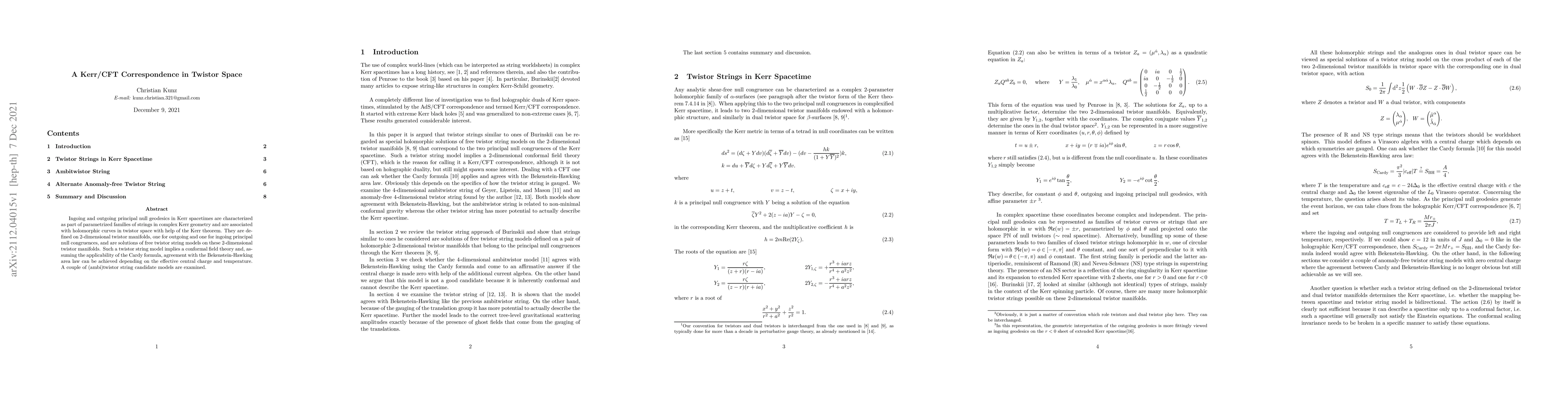 This paper explores a Kerr/CFT correspondence in twistor space, where ingoing and outgoing principal null geodesics in Kerr spacetimes are characterized as strings in complex Kerr geometry and associated with holomorphic curves in twistor space. The study examines (ambi)twistor string models that imply a conformal field theory, aiming to achieve agreement with the Bekenstein-Hawking area law through the Cardy formula.