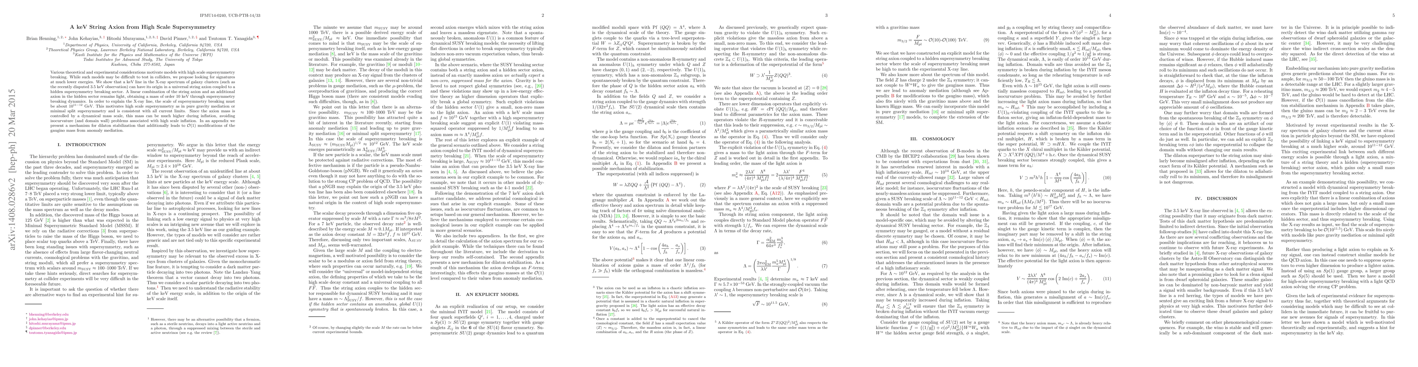 Various theoretical and experimental considerations motivate models with high scale supersymmetry breaking. While such models may be difficult to test in colliders, we propose looking for signatures at much lower energies. We show that a keV line in the X-ray spectrum of galaxy clusters (such as the recently disputed 3.5 keV observation) can have its origin in a universal string axion coupled to a hidden supersymmetry breaking sector. A linear combination of the string axion and an additional axion in the hidden sector remains light, obtaining a mass of order 10 keV through supersymmetry breaking dynamics. In order to explain the X-ray line, the scale of supersymmetry breaking must be about $10^{11-12}$ GeV. This motivates high scale supersymmetry as in pure gravity mediation or minimal split supersymmetry and is consistent with all current limits. Since the axion mass is controlled by a dynamical mass scale, this mass can be much higher during inflation, avoiding isocurvature (and domain wall) problems associated with high scale inflation. In an appendix we present a mechanism for dilaton stabilization that additionally leads to $\mathcal{O}(1)$ modifications of the gaugino mass from anomaly mediation.