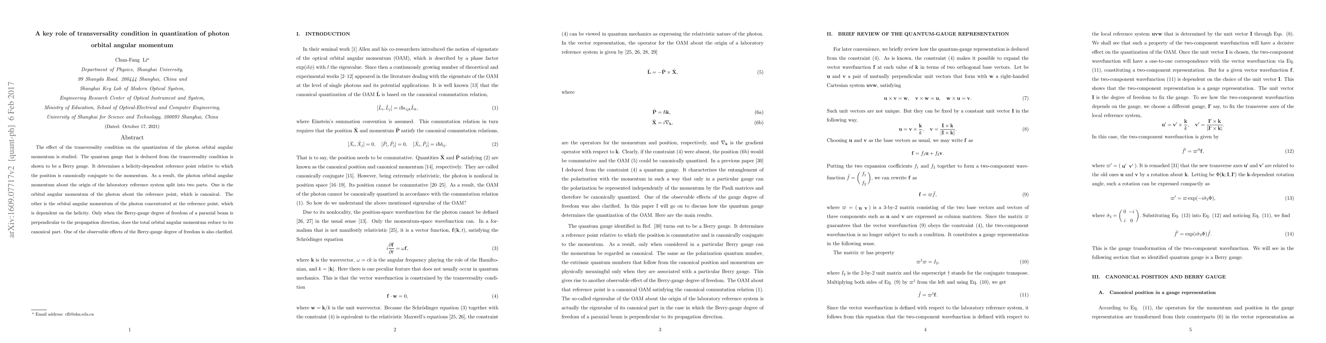 This paper investigates how the transversality condition influences the quantization of photon orbital angular momentum, revealing that it leads to a quantum gauge known as the Berry gauge. This gauge splits the photon's orbital angular momentum into a canonical part and a helicity-dependent part, with observable effects clarified.