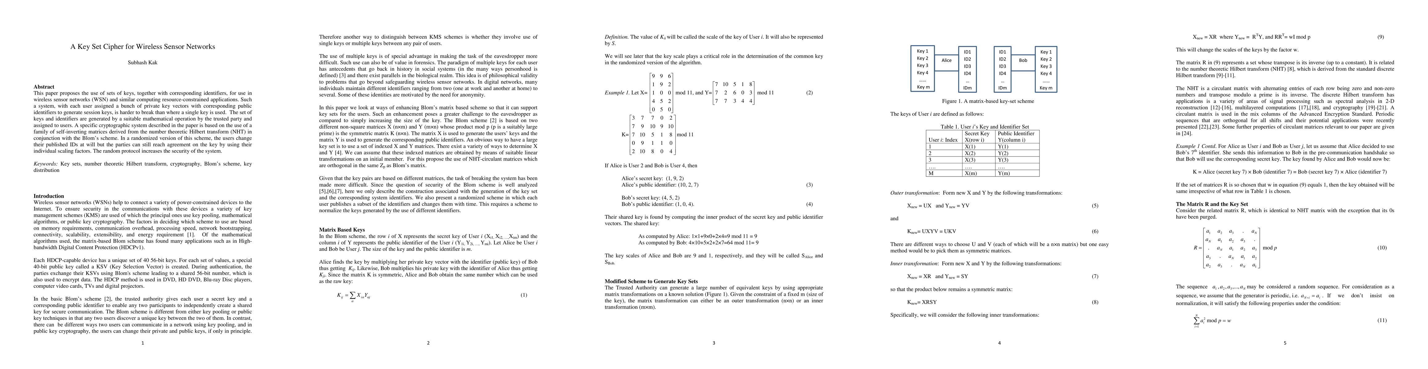 This paper introduces a key set cipher for wireless sensor networks using self-inverting matrices from the number theoretic Hilbert transform and Blom's scheme, enhancing security through randomized user ID changes and individual scaling factors.