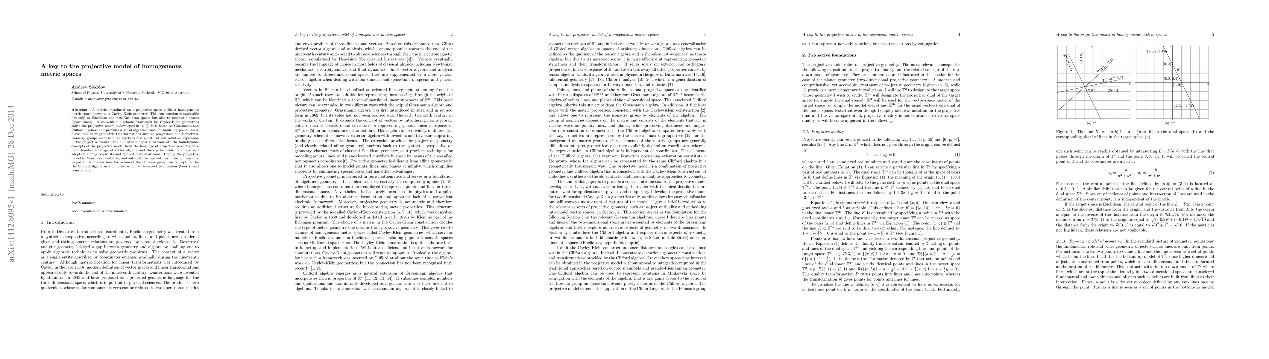 A metric introduced on a projective space yields a homogeneous metric space known as a Cayley-Klein geometry. This construction is applicable not only to Euclidean and non-Euclidean spaces but also to kinematic spaces (space-times). A convenient algebraic framework for Cayley-Klein geometries called the projective model is developed in [1, 2]. It is based on Grassmann and Clifford algebras and provides a set of algebraic tools for modeling points, lines, planes and their geometric transformations such as projections and isometries. Isometry groups and their Lie algebras find a natural and intuitive expression in the projective model. The aim of this paper is to translate the foundational concepts of the projective model from the language of projective geometry to a more familiar language of vector algebra and thereby facilitate its spread and adoption among physicists and applied mathematicians. I apply the projective model to Minkowski, de-Sitter, and anti-de-Sitter space-times in two dimensions. In particular, I show how the action of the Poincare group can be captured by the Clifford algebra in a uniform fashion with respect to rotations (boosts) and translations.