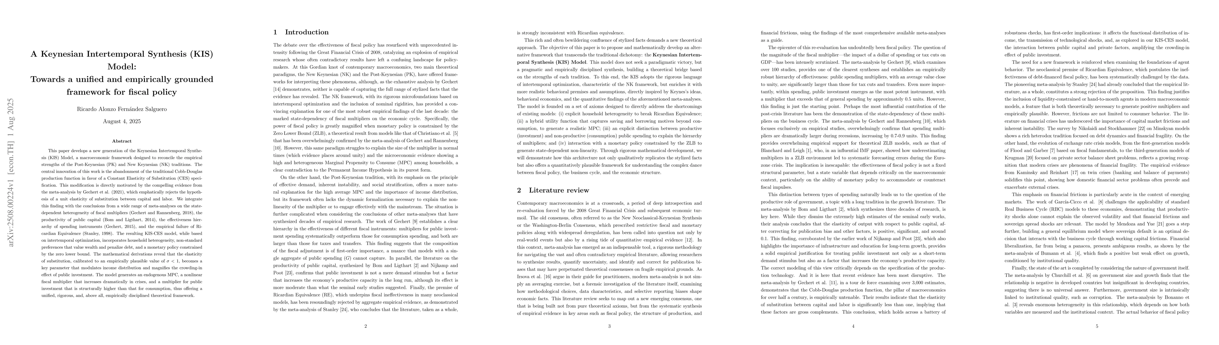 This paper develops a new generation of the Keynesian Intertemporal Synthesis (KIS) Model, a macroeconomic framework designed to reconcile the empirical strengths of the Post-Keynesian (PK) and New Keynesian (NK) traditions. The central innovation of this work is the abandonment of the traditional Cobb-Douglas production function in favor of a Constant Elasticity of Substitution (CES) specification. This modification is directly motivated by the compelling evidence from the meta-analysis by Gechert et al. (2021), which emphatically rejects the hypothesis of a unit elasticity of substitution between capital and labor. We integrate this finding with the conclusions from a wide range of meta-analyses on the state-dependent heterogeneity of fiscal multipliers (Gechert and Rannenberg, 2018), the productivity of public capital (Bom and Ligthart, 2014), the effectiveness hierarchy of spending instruments (Gechert, 2015), and the empirical failure of Ricardian Equivalence (Stanley, 1998). The resulting KIS-CES model, while based on intertemporal optimization, incorporates household heterogeneity, non-standard preferences that value wealth and penalize debt, and a monetary policy constrained by the zero lower bound. The mathematical derivations reveal that the elasticity of substitution, calibrated to an empirically plausible value of $\sigma < 1$, becomes a key parameter that modulates income distribution and magnifies the crowding-in effect of public investment. The model generates an endogenous MPC, a nonlinear fiscal multiplier that increases dramatically in crises, and a multiplier for public investment that is structurally higher than that for consumption, thus offering a unified, rigorous, and, above all, empirically disciplined theoretical framework.