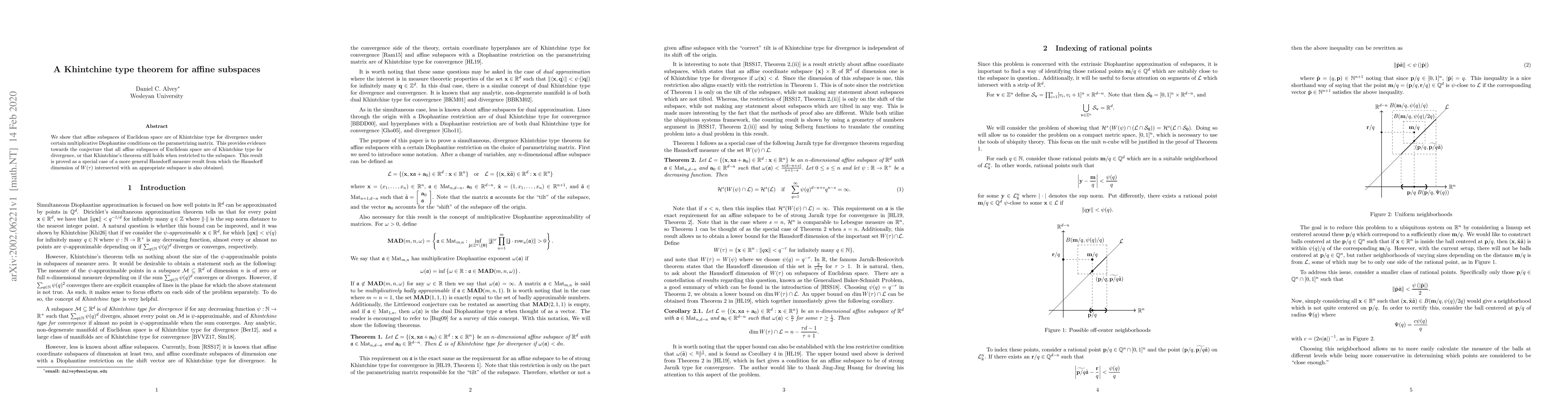 This paper demonstrates that affine subspaces in Euclidean space exhibit Khintchine type behavior for divergence under certain Diophantine conditions on the parametrizing matrix, supporting the conjecture that all such subspaces are of this type. The proof is part of a broader result concerning Hausdorff measure and dimension.