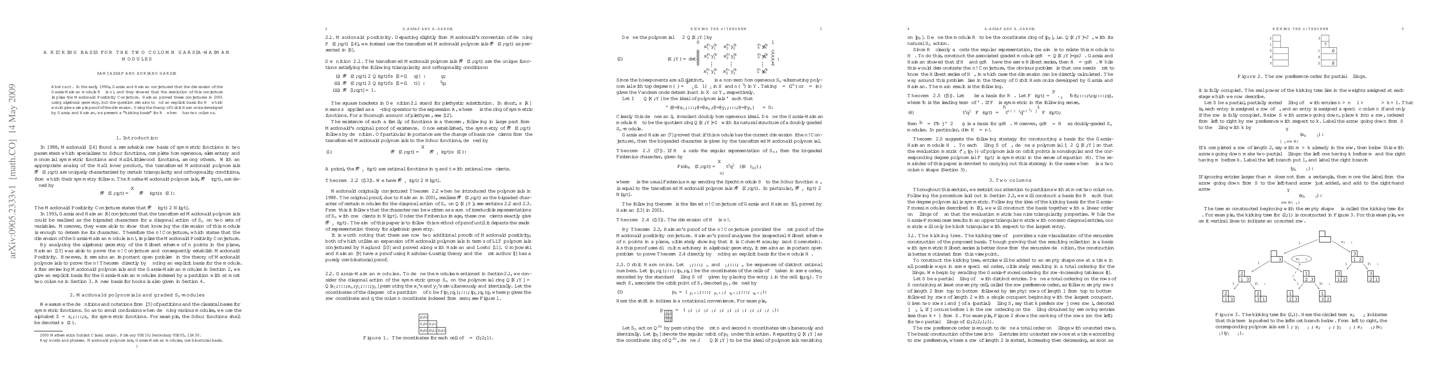 In the early 1990s, Garsia and Haiman conjectured that the dimension of the Garsia-Haiman module is n!, and they showed that the resolution of this conjecture implies the Macdonald Positivity Conjecture. Haiman proved these conjectures in 2001 using algebraic geometry, but the question remains to find an explicit basis for the module which would give a simple proof of the dimension. Using the theory of Orbit Harmonics developed by Garsia and Haiman, we present a "kicking basis" for Garsia-Haiman modules indexed by a partition with at most two columns.