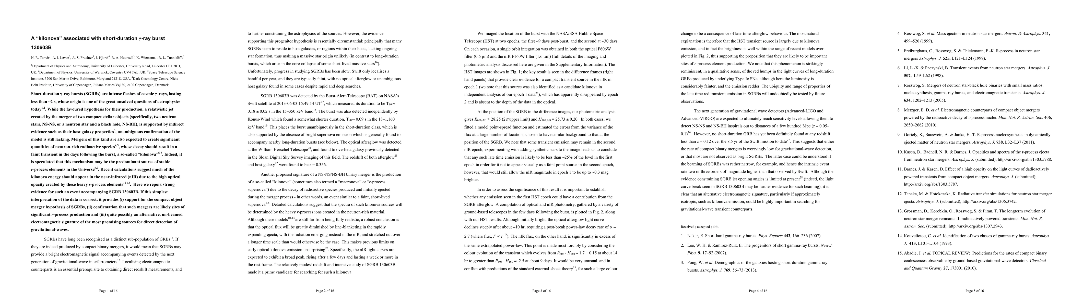 This paper reports strong evidence for a "kilonova" following the short-duration gamma-ray burst 130603B, supporting the neutron star merger hypothesis for SGRBs and confirming that these mergers are significant sources of r-process elements. The kilonova provides an un-beamed electromagnetic signature potentially aiding gravitational wave detection.