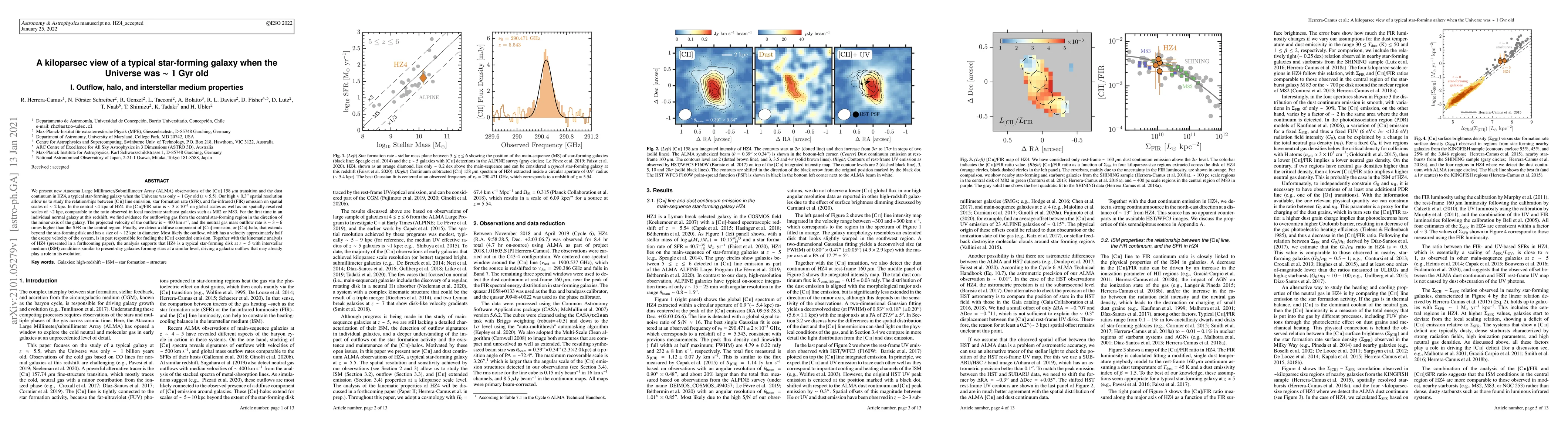 This paper uses ALMA observations to study HZ4, a star-forming galaxy at $z\approx5.5$, revealing a $\sim400$ km s$^{-1}$ outflowing gas and a [CII]-halo extending $\sim12$ kpc, suggesting ISM conditions and outflow dynamics similar to present-day star-forming galaxies.