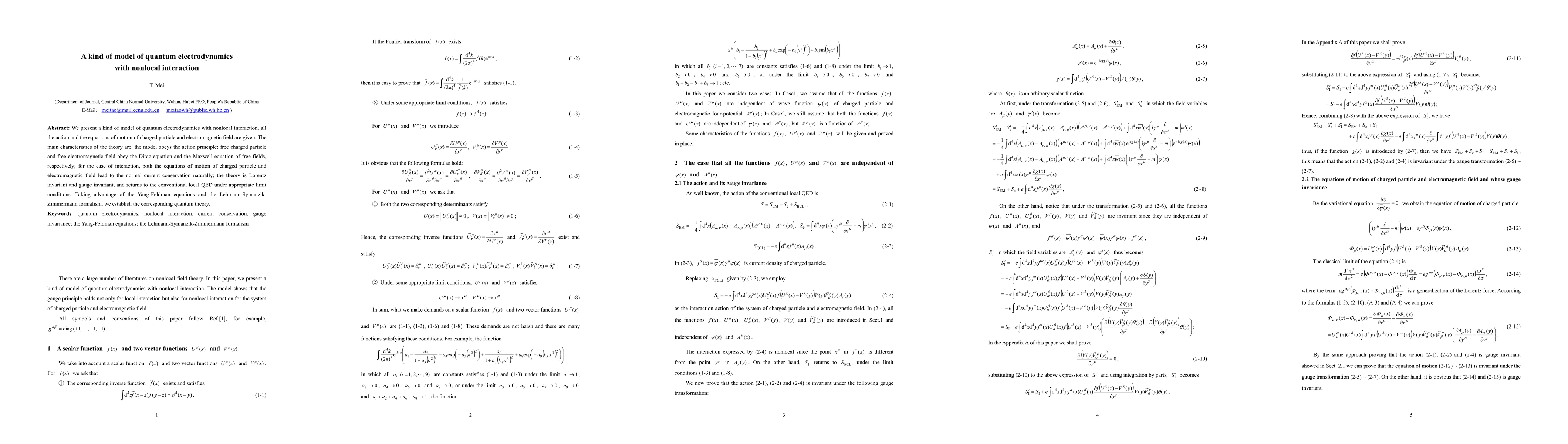 We present a kind of model of quantum electrodynamics with nonlocal interaction, all the action and the equations of motion of charged particle and electromagnetic field are given. The main characteristics of the theory are: the model obeys the action principle; free charged particle and free electromagnetic field obey the Dirac equation and the Maxwell equation of free fields, respectively; for the case of interaction, both the equations of motion of charged particle and electromagnetic field lead to the normal current conservation naturally; the theory is Lorentz invariant and gauge invariant, and returns to the conventional local QED under appropriate limit conditions. Taking advantage of the Yang-Feldman equations and the Lehmann-Symanzik- Zimmermann formalism, we establish the corresponding quantum theory.