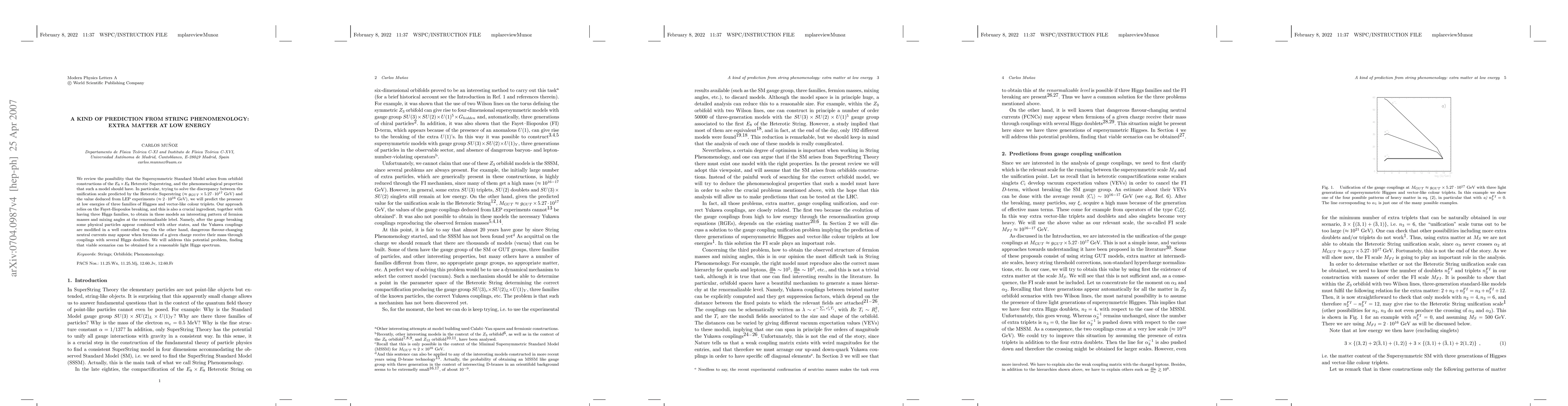 We review the possibility that the Supersymmetric Standard Model arises from orbifold constructions of the E_8 x E_8 Heterotic Superstring, and the phenomenological properties that such a model should have. In particular, trying to solve the discrepancy between the unification scale predicted by the Heterotic Superstring (g_{GUT}x5.27x10^{17} GeV) and the value deduced from LEP experiments (2x10^{16} GeV), we will predict the presence at low energies of three families of Higgses and vector-like colour triplets. Our approach relies on the Fayet-Iliopoulos breaking, and this is also a crucial ingredient, together with having three Higgs families, to obtain in these models an interesting pattern of fermion masses and mixing angles at the renormalizable lebel. Namely, after the gauge breaking some physical particles appear combined with other states, and the Yukawa couplings are modified in a well controlled way. On the other hand, dangerous flavour-changing neutral currents may appear when fermions of a given charge receive their mass through couplings with several Higgs doublets. We will address this potential problem, finding that viable scenarios can be obtained for a reasonable light Higgs spectrum.