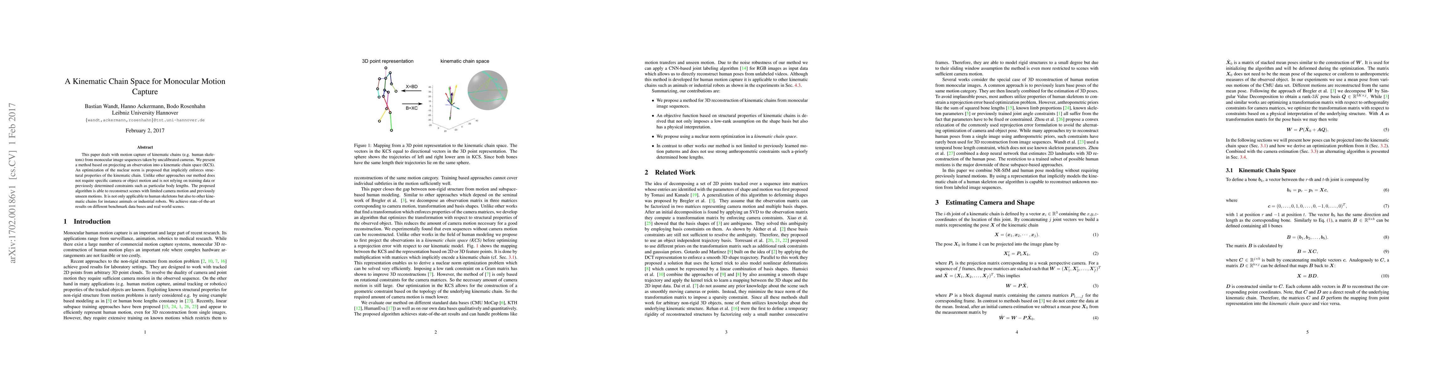 This paper deals with motion capture of kinematic chains (e.g. human skeletons) from monocular image sequences taken by uncalibrated cameras. We present a method based on projecting an observation into a kinematic chain space (KCS). An optimization of the nuclear norm is proposed that implicitly enforces structural properties of the kinematic chain. Unlike other approaches our method does not require specific camera or object motion and is not relying on training data or previously determined constraints such as particular body lengths. The proposed algorithm is able to reconstruct scenes with limited camera motion and previously unseen motions. It is not only applicable to human skeletons but also to other kinematic chains for instance animals or industrial robots. We achieve state-of-the-art results on different benchmark data bases and real world scenes.