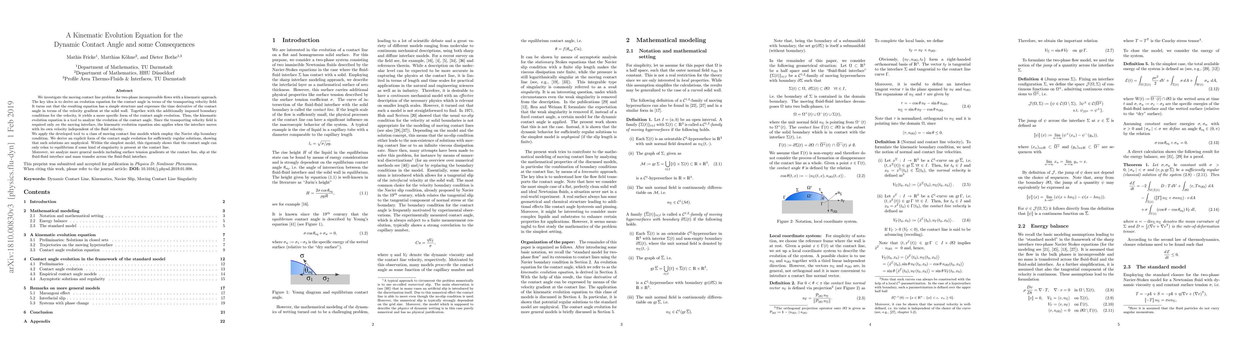 We investigate the moving contact line problem for two-phase incompressible flows with a kinematic approach. The key idea is to derive an evolution equation for the contact angle in terms of the transporting velocity field. It turns out that the resulting equation has a simple structure and expresses the time derivative of the contact angle in terms of the velocity gradient at the solid wall. Together with the additionally imposed boundary conditions for the velocity, it yields a more specific form of the contact angle evolution. Thus, the kinematic evolution equation is a tool to analyze the evolution of the contact angle. Since the transporting velocity field is required only on the moving interface, the kinematic evolution equation also applies when the interface moves with its own velocity independent of the fluid velocity. We apply the developed tool to a class of moving contact line models which employ the Navier slip boundary condition. We derive an explicit form of the contact angle evolution for sufficiently regular solutions, showing that such solutions are unphysical. Within the simplest model, this rigorously shows that the contact angle can only relax to equilibrium if some kind of singularity is present at the contact line. Moreover, we analyze more general models including surface tension gradients at the contact line, slip at the fluid-fluid interface and mass transfer across the fluid-fluid interface.
