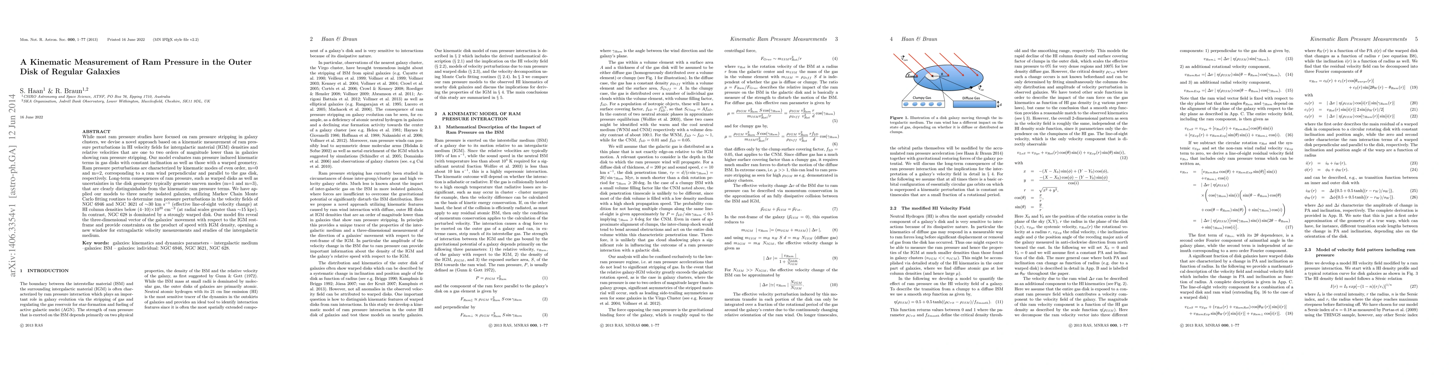 While most ram pressure studies have focused on ram pressure stripping in galaxy clusters, we devise a novel approach based on a kinematic measurement of ram pressure perturbations in HI velocity fields for intergalactic material (IGM) densities and relative velocities that are one to two orders of magnitude lower than in galaxies showing ram pressure stripping. Our model evaluates ram pressure induced kinematic terms in gas disks with constant inclination as well as those with a warped geometry. Ram pressure perturbations are characterized by kinematic modes of even order, m=0 and m=2, corresponding to a ram wind perpendicular and parallel to the gas disk, respectively. Long-term consequences of ram pressure, such as warped disks as well as uncertainties in the disk geometry typically generate uneven modes (m=1 and m=3), that are clearly distinguishable from the kinematic ram pressure terms. We have applied our models to three nearby isolated galaxies, utilizing Markov Chain Monte Carlo fitting routines to determine ram pressure perturbations in the velocity fields of NGC 6946 and NGC 3621 of ~30km s$^{-1}$ (effective line-of-sight velocity change) at HI column densities below (4-10)$\times$10$^{20}$cm$^{-2}$ (at radial scales greater than ~15kpc). In contrast, NGC 628 is dominated by a strongly warped disk. Our model fits reveal the three-dimensional vector of the galaxies' movement with respect to the IGM rest-frame and provide constraints on the product of speed with IGM density, opening a new window for extragalactic velocity measurements and studies of the intergalactic medium.