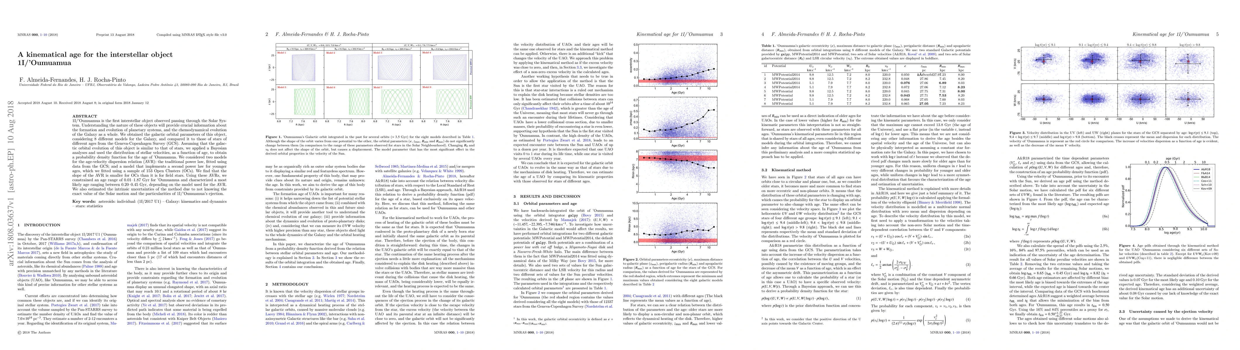 1I/'Oumuamua is the first interstellar object observed passing through the Solar System. Understanding the nature of these objects will provide crucial information about the formation and evolution of planetary systems, and the chemodynamical evolution of the Galaxy as a whole. We obtained the galactic orbital parameters of this object, considering 8 different models for the Galaxy, and compared it to those of stars of different ages from the Geneva-Copenhagen Survey (GCS). Assuming that the galactic orbital evolution of this object is similar to that of stars, we applied a Bayesian analyses and used the distribution of stellar velocities, as a function of age, to obtain a probability density function for the age of 'Oumuamua. We considered two models for the age-velocity dispersion relation (AVR): the traditional power law, fitted using data from the GCS; and a model that implements a second power law for younger ages, which we fitted using a sample of 153 Open Clusters (OCs). We find that the slope of the AVR is smaller for OCs than it is for field stars. Using these AVRs, we constrained an age range of 0.01-1.87 Gyr for 'Oumuamua and characterized a most likely age ranging between 0.20-0.45 Gyr, depending on the model used for the AVR. We also estimated the intrinsic uncertainties of the method due to not knowing the exact value of the Solar motion and the particularities of 1I/'Oumuamua's ejection.