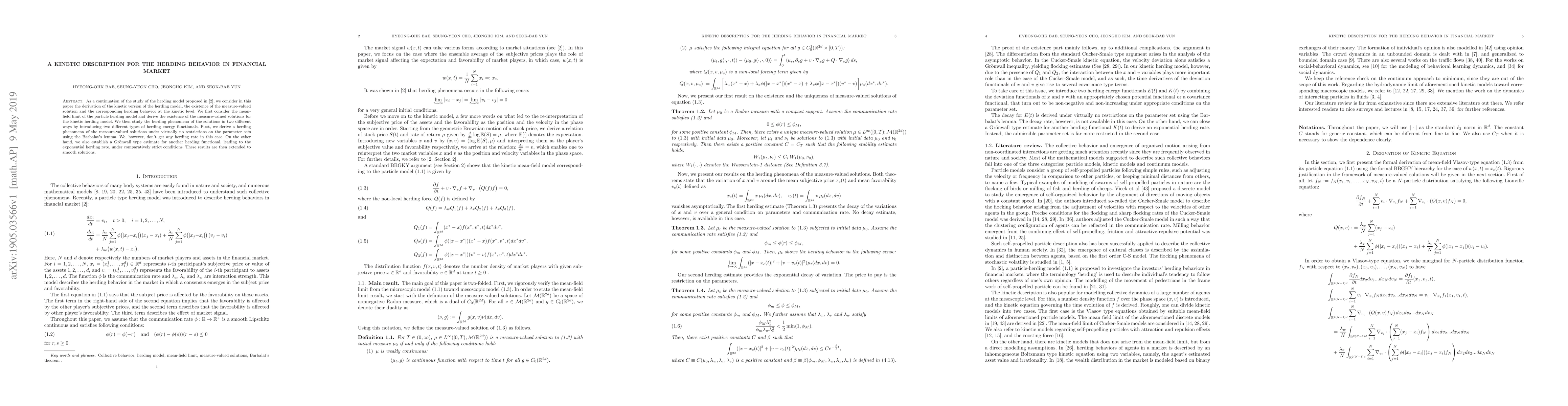 This paper derives a kinetic version of a herding model in financial markets, proving the existence of measure-valued solutions and analyzing herding behavior through two types of energy functionals: one providing herding phenomena without rate, and another yielding an exponential herding rate under stricter conditions.