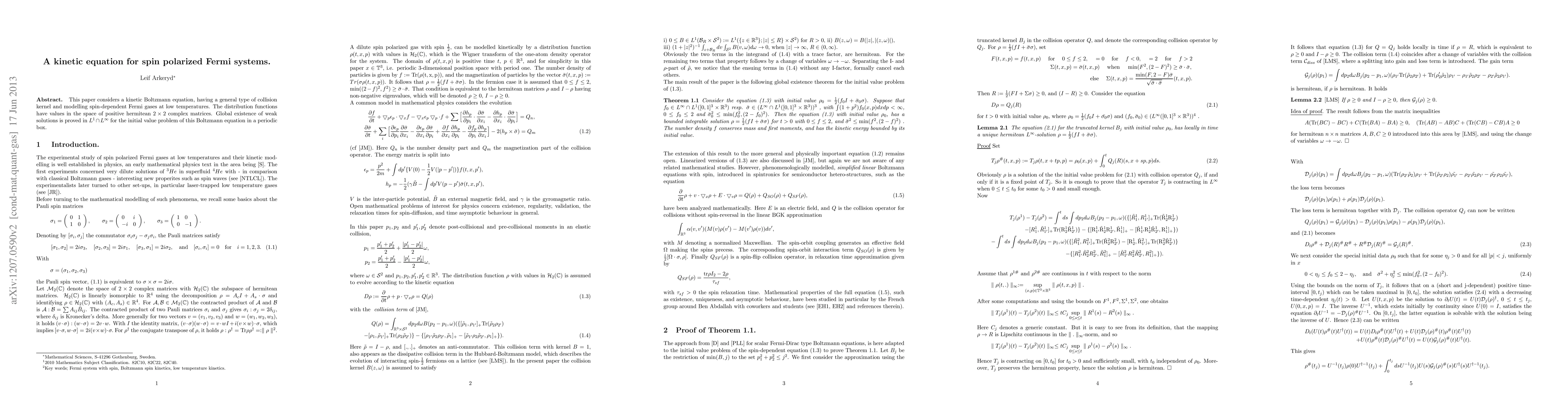 This paper develops a kinetic Boltzmann equation to model spin-polarized Fermi gases at low temperatures, proving global existence of bounded weak solutions in L1 for the initial value problem within a periodic box. The distribution functions are represented as positive hermitean 2x2 complex matrices.