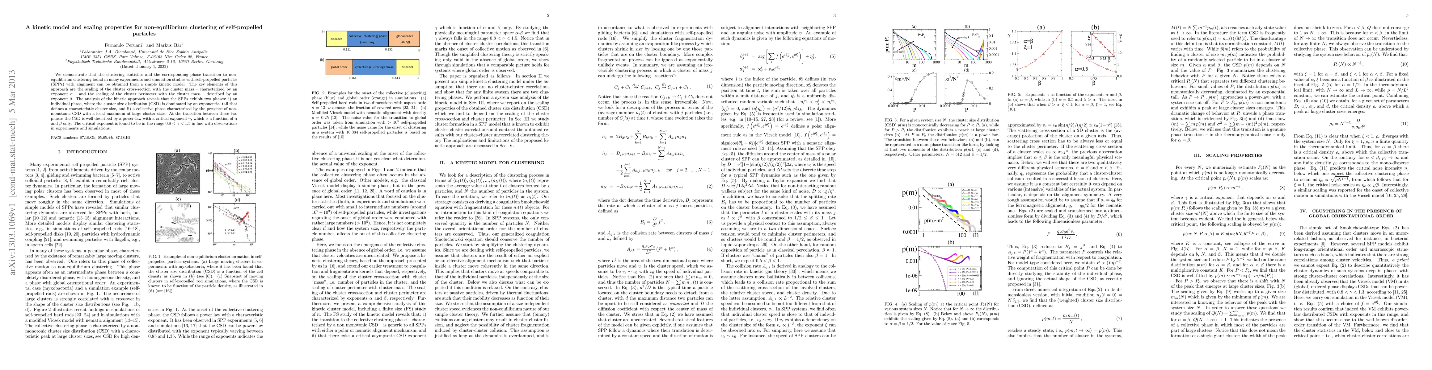 This paper presents a kinetic model explaining the non-equilibrium clustering of self-propelled particles (SPPs) through scaling properties, identifying two phases: an individual phase with an exponential cluster size distribution and a collective phase with a non-monotonic distribution. The transition between these phases is characterized by a critical exponent.