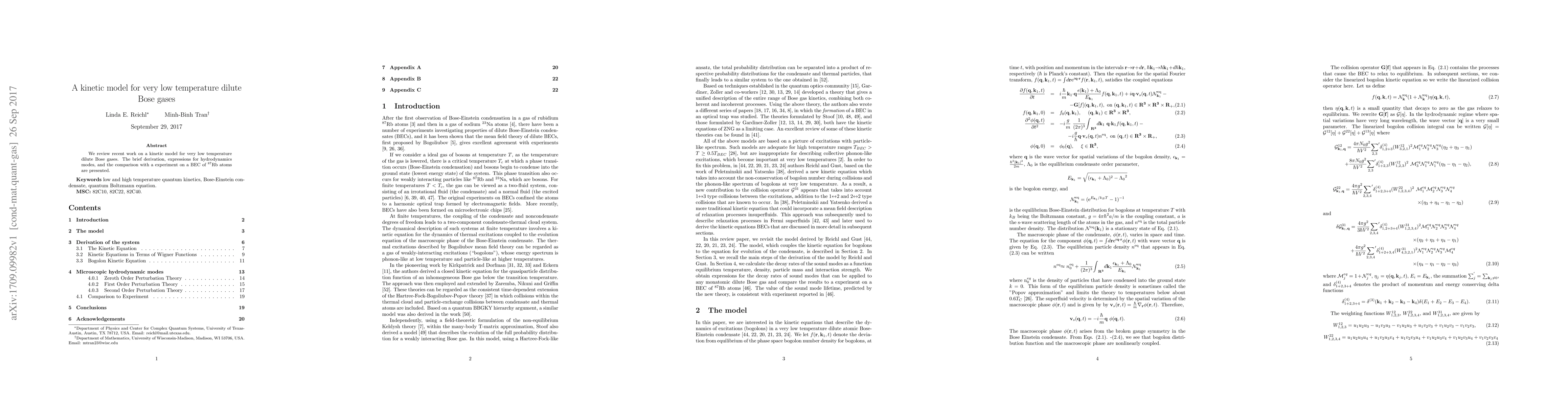 We review recent work on a kinetic model for very low temperature dilute Bose gases. The brief derivation, expressions for hydrodynamics modes, and the comparison with a experiment on a BEC of $^{87}{\rm Rb}$ atoms are presented.