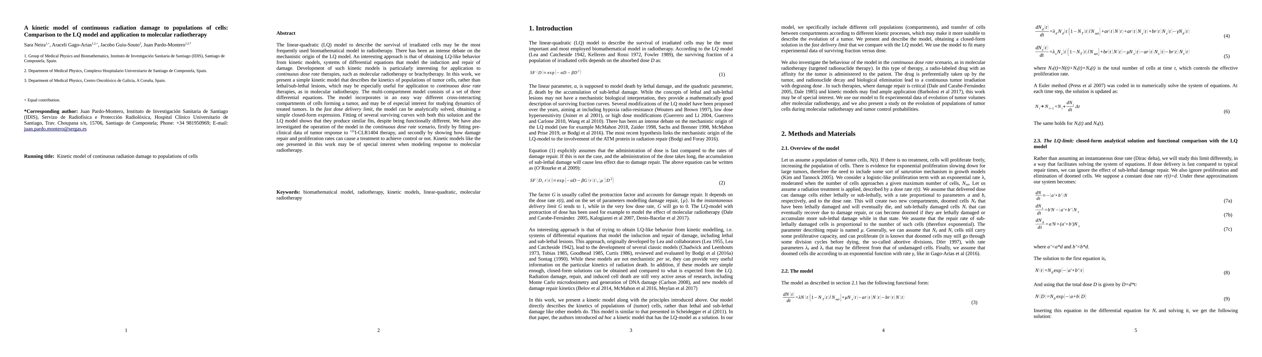 This paper presents a kinetic model describing the dynamics of tumor cell populations under continuous radiation damage, comparing it to the linear-quadratic (LQ) model commonly used in radiotherapy. The model, consisting of three differential equations, shows similar fitting to the LQ model and is particularly useful for continuous dose rate therapies like molecular radiotherapy.