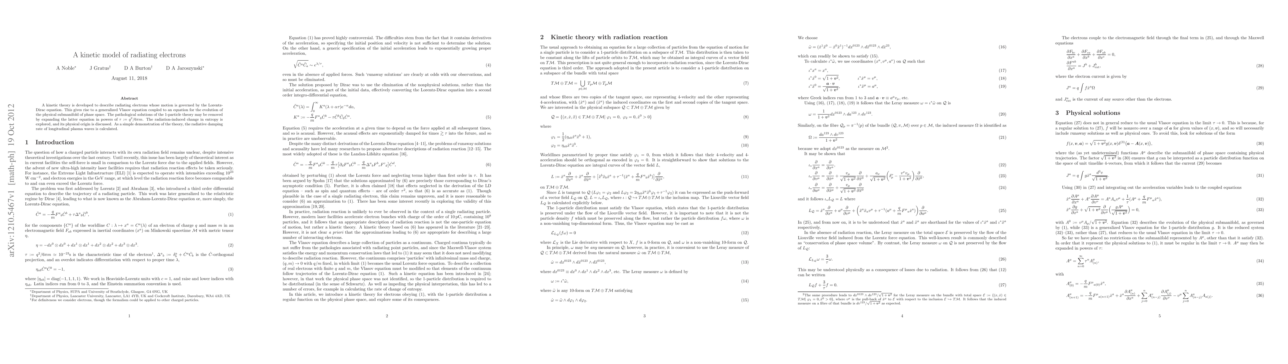 A kinetic theory is developed to describe radiating electrons whose motion is governed by the Lorentz-Dirac equation. This gives rise to a generalized Vlasov equation coupled to an equation for the evolution of the physical submanifold of phase space. The pathological solutions of the 1-particle theory may be removed by expanding the latter equation in powers of $\tau := q^2/ 6\pi m$. The radiation-induced change in entropy is explored, and its physical origin is discussed. As a simple demonstration of the theory, the radiative damping rate of longitudinal plasma waves is calculated.