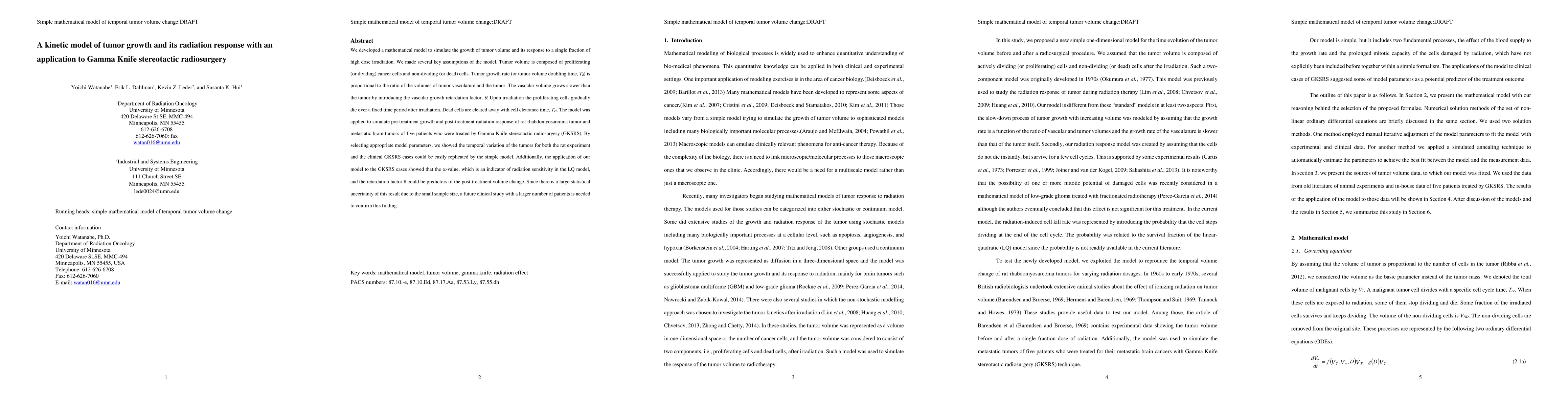 This paper presents a mathematical model to simulate tumor growth and its response to high-dose radiation, focusing on Gamma Knife stereotactic radiosurgery. The model incorporates proliferating and non-dividing cells, vascular growth, and the effects of radiation on cell death. It successfully replicates tumor growth and radiation response in both rat experiments and clinical cases, suggesting potential predictors for post-treatment volume change, though larger studies are needed to confirm these findings.