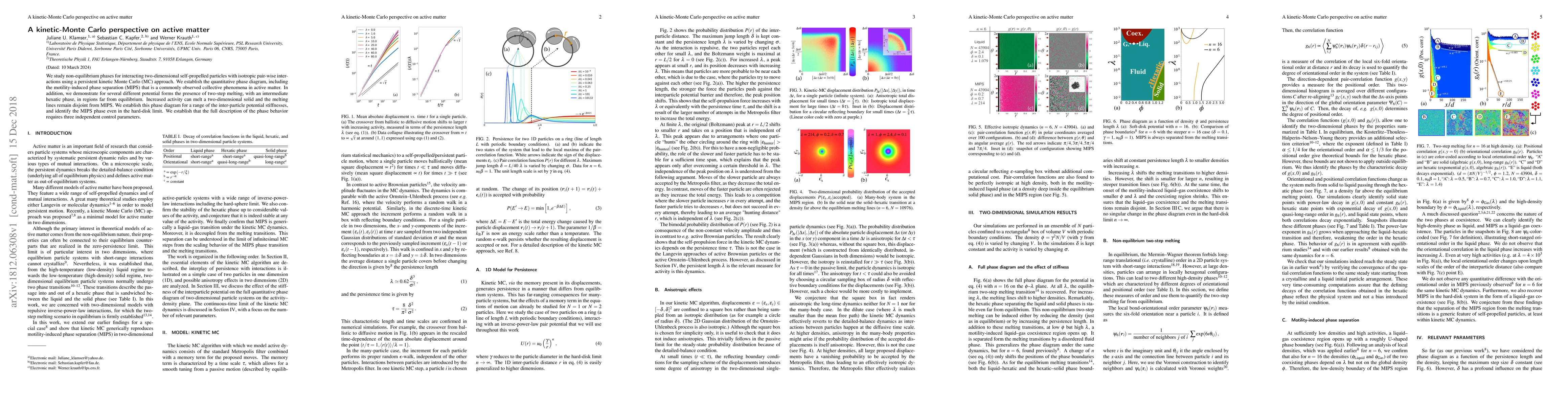 We study non-equilibrium phases for interacting two-dimensional self-propelled particles with isotropic pair-wise interactions using a persistent kinetic Monte Carlo (MC) approach. We establish the quantitative phase diagram, including the motility-induced phase separation (MIPS) that is a commonly observed collective phenomena in active matter. In addition, we demonstrate for several different potential forms the presence of two-step melting, with an intermediate hexatic phase, in regions far from equilibrium. Increased activity can melt a two-dimensional solid and the melting lines remain disjoint from MIPS. We establish this phase diagram for a range of the inter-particle potential stiffnesses, and identify the MIPS phase even in the hard-disk limit. We establish that the full description of the phase behavior requires three independent control parameters.