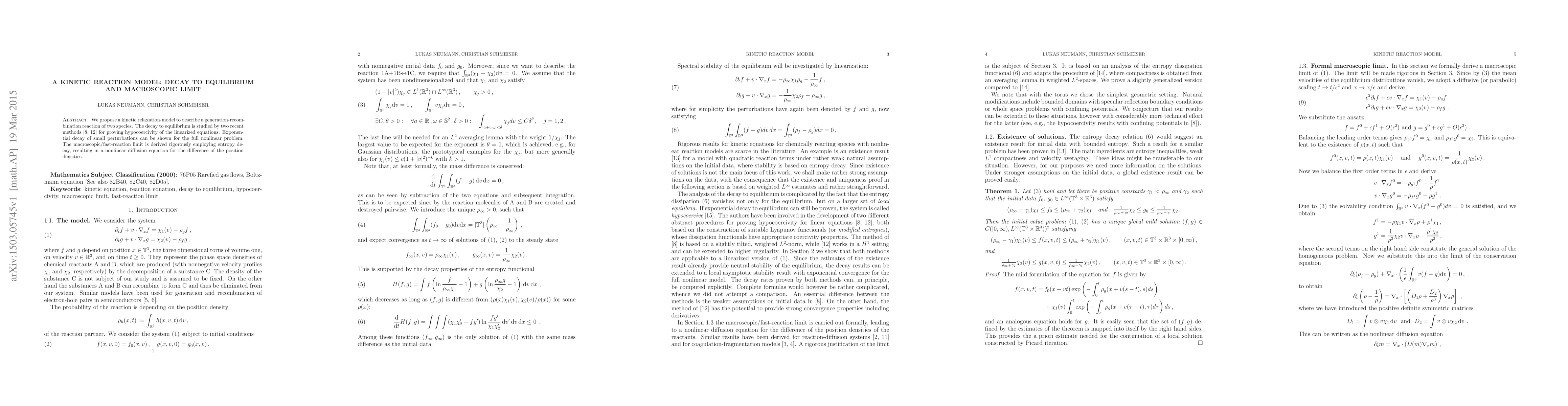 Researchers developed a kinetic reaction model to study generation-recombination reactions, showing exponential decay of small perturbations and deriving a nonlinear diffusion equation for the macroscopic limit.