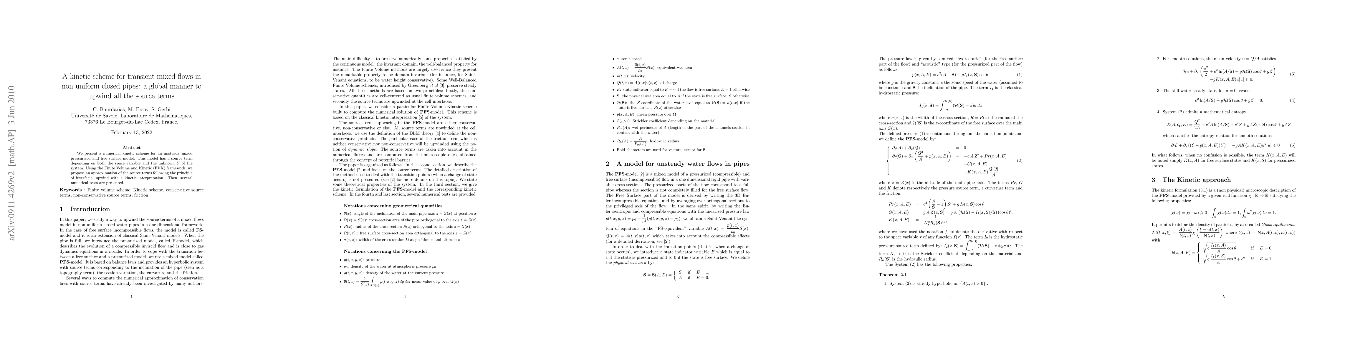 We present a numerical kinetic scheme for an unsteady mixed pressurised and free surface model. This model has a source term depending on both the space variable and the unknown, U, of the system. The source term is composed by a topography, a section variation, a curvature (also called corrective) and a friction term. Using the Finite Volume and Kinetic (FVK) framework, we propose an approximation of the source terms following the principle of interfacial upwind with a kinetic interpretation: the source term is not treated as a volumic term, but included in the numerical fluxes. Then, several numerical tests are presented.