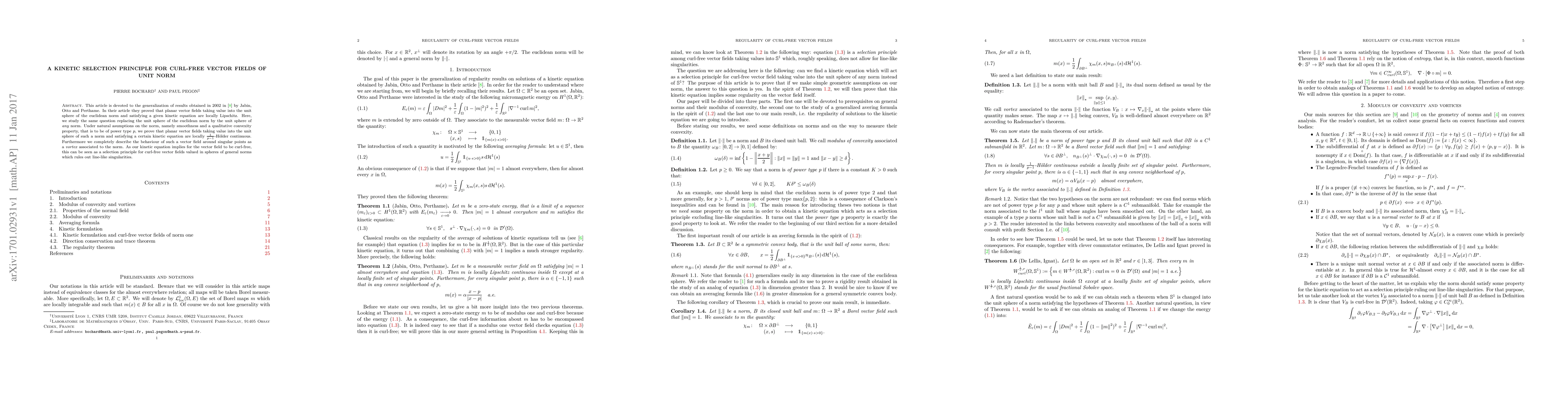 This article is devoted to the generalization of results obtained in 2002 by Jabin, Otto and Perthame. In their article they proved that planar vector fields taking value into the unit sphere of the euclidean norm and satisfying a given kinetic equation are locally Lipschitz. Here, we study the same question replacing the unit sphere of the euclidean norm by the unit sphere of \emph{any} norm. Under natural asumptions on the norm, namely smoothness and a qualitative convexity property, that is to be of power type $p$, we prove that planar vector fields taking value into the unit sphere of such a norm and satisfying a certain kinetic equation are locally $\frac{1}{p-1}$-H\"older continuous. Furthermore we completely describe the behaviour of such a vector field around singular points as a \emph{vortex} associated to the norm. As our kinetic equation implies for the vector field to be curl-free, this can be seen as a selection principle for curl-free vector fields valued in spheres of general norms which rules out line-like singularities.