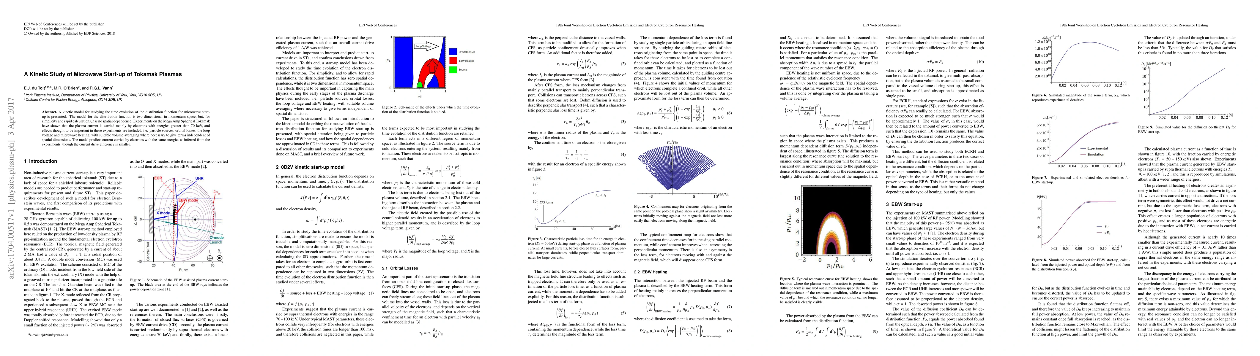A kinetic model for studying the time evolution of the distribution function for microwave start-up is presented. The model for the distribution function is two dimensional in momentum space, but, for simplicity and rapid calculations, has no spatial dependence. Experiments on the Mega Amp Spherical Tokamak have shown that the plasma current is carried mainly by electrons with energies greater than $70$ keV, and effects thought to be important in these experiments are included, i.e. particle sources, orbital losses, the loop voltage and microwave heating, with suitable volume averaging where necessary to give terms independent of spatial dimensions. The model predicts current carried by electrons with the same energies as inferred from the experiments, though the current drive efficiency is smaller.