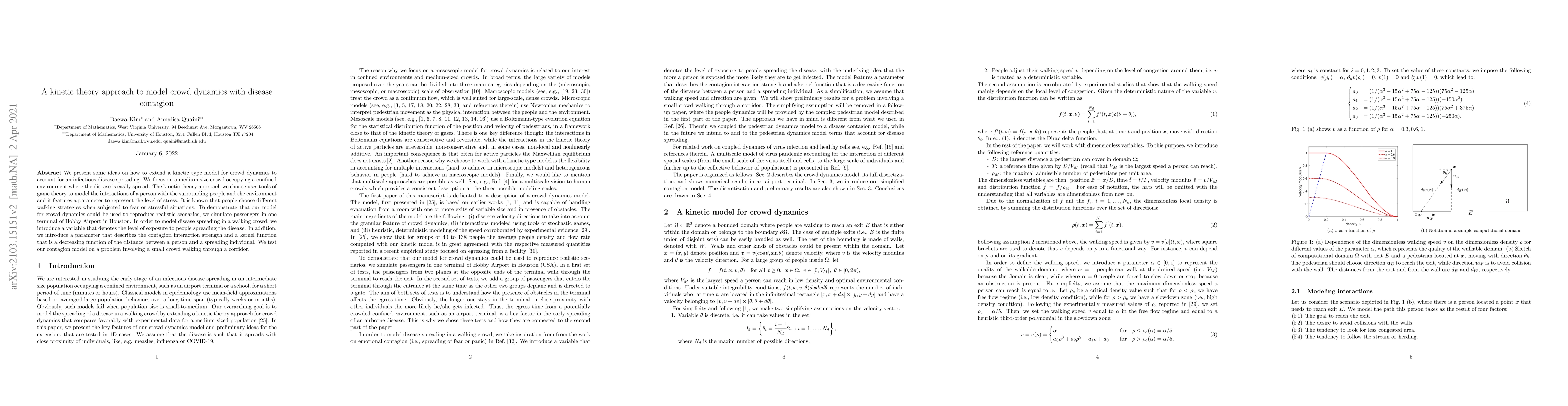We present some ideas on how to extend a kinetic type model for crowd dynamics to account for an infectious disease spreading. We focus on a medium size crowd occupying a confined environment where the disease is easily spread. The kinetic theory approach we choose uses tools of game theory to model the interactions of a person with the surrounding people and the environment and it features a parameter to represent the level of stress. It is known that people choose different walking strategies when subjected to fear or stressful situations. To demonstrate that our model for crowd dynamics could be used to reproduce realistic scenarios, we simulate passengers in one terminal of Hobby Airport in Houston. In order to model disease spreading in a walking crowd, we introduce a variable that denotes the level of exposure to people spreading the disease. In addition, we introduce a parameter that describes the contagion interaction strength and a kernel function that is a decreasing function of the distance between a person and a spreading individual. We test our contagion model on a problem involving a small crowd walking through a corridor.