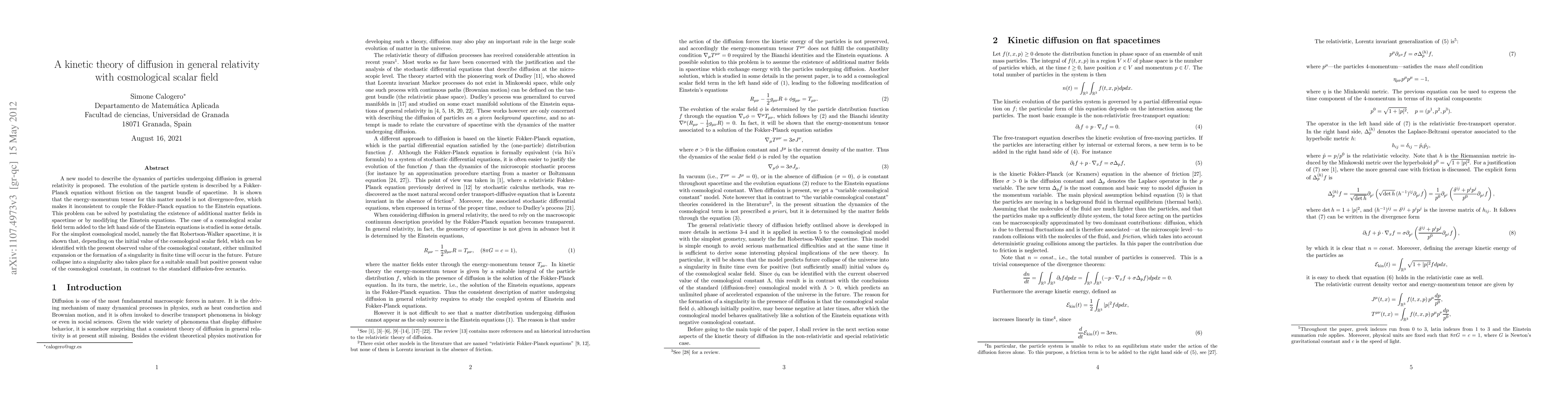 A new model to describe the dynamics of particles undergoing diffusion in general relativity is proposed. The evolution of the particle system is described by a Fokker-Planck equation without friction on the tangent bundle of spacetime. It is shown that the energy-momentum tensor for this matter model is not divergence-free, which makes it inconsistent to couple the Fokker-Planck equation to the Einstein equations. This problem can be solved by postulating the existence of additional matter fields in spacetime or by modifying the Einstein equations. The case of a cosmological scalar field term added to the left hand side of the Einstein equations is studied in some details. For the simplest cosmological model, namely the flat Robertson-Walker spacetime, it is shown that, depending on the initial value of the cosmological scalar field, which can be identified with the present observed value of the cosmological constant, either unlimited expansion or the formation of a singularity in finite time will occur in the future. Future collapse into a singularity also takes place for a suitable small but positive present value of the cosmological constant, in contrast to the standard diffusion-free scenario.