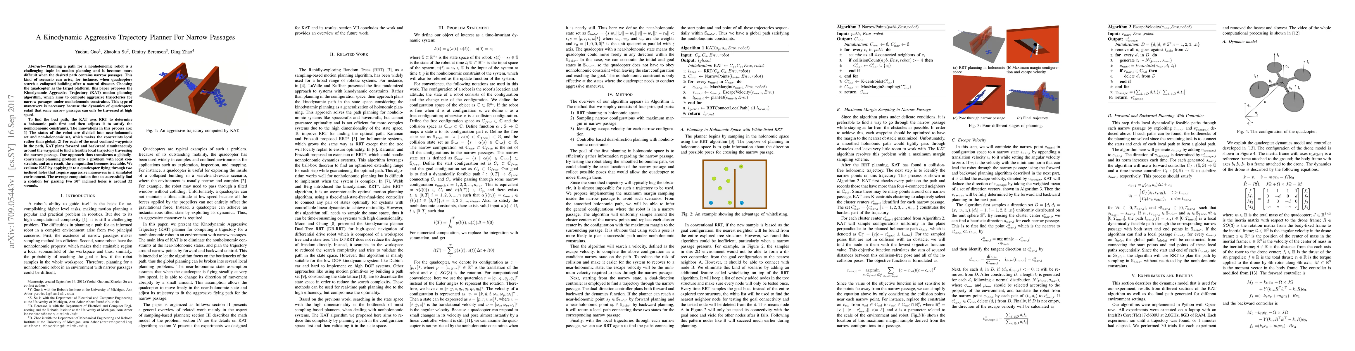 Planning a path for a nonholonomic robot is a challenging topic in motion planning and it becomes more difficult when the desired path contains narrow passages. This kind of scenario can arise, for instance, when quadcopters search a collapsed building after a natural disaster. Choosing the quadcopter as the target platform, this paper proposes the Kinodynamic Aggressive Trajectory (KAT) motion planning algorithm, which aims to compute aggressive trajectories for narrow passages under nonholonomic constraints. This type of maneuvers is necessary because the dynamics of quadcopters entail that some narrow passages can only be traversed at high speed. To find the best path, the KAT uses RRT to determine a holonomic path first and then adjusts it to satisfy the nonholonomic constraints. The innovations in this process are: 1) The states of the robot are divided into near-holonomic set and non-holonomic set, which makes the constraints local rather than global; 2) For each of the most confined waypoints in the path, KAT plans forward and backward simultaneously around the waypoint to find a feasible local trajectory traversing the narrow passage. Our approach thus transforms a globally-constrained planning problem into a problem with local constraints, and as a result, the computation becomes tractable. We evaluate KAT by applying it to a quadcopter flying through two inclined holes that require aggressive maneuvers in a simulated environment. The average computation time to successfully find a solution for passing two 50 degree inclined holes is around 32 seconds.