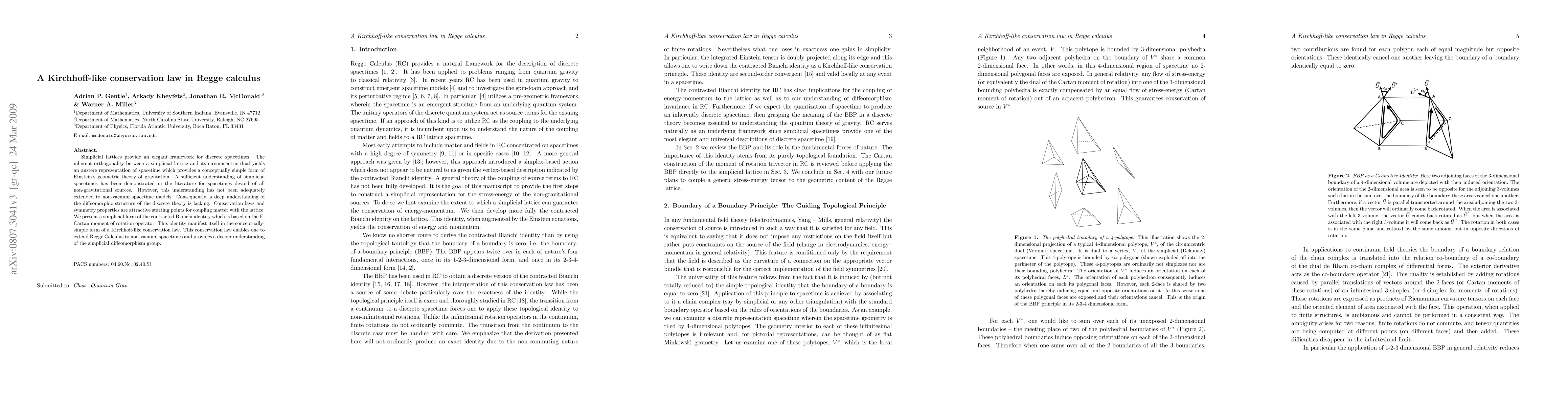 Simplicial lattices provide an elegant framework for discrete spacetimes. The inherent orthogonality between a simplicial lattice and its circumcentric dual yields an austere representation of spacetime which provides a conceptually simple form of Einstein's geometric theory of gravitation. A sufficient understanding of simplicial spacetimes has been demonstrated in the literature for spacetimes devoid of all non-gravitational sources. However, this understanding has not been adequately extended to non-vacuum spacetime models. Consequently, a deep understanding of the diffeomorphic structure of the discrete theory is lacking. Conservation laws and symmetry properties are attractive starting points for coupling matter with the lattice. We present a simplicial form of the contracted Bianchi identity which is based on the E. Cartan moment of rotation operator. This identity manifests itself in the conceptually-simple form of a Kirchhoff-like conservation law. This conservation law enables one to extend Regge Calculus to non-vacuum spacetimes and provides a deeper understanding of the simplicial diffeomorphism group.