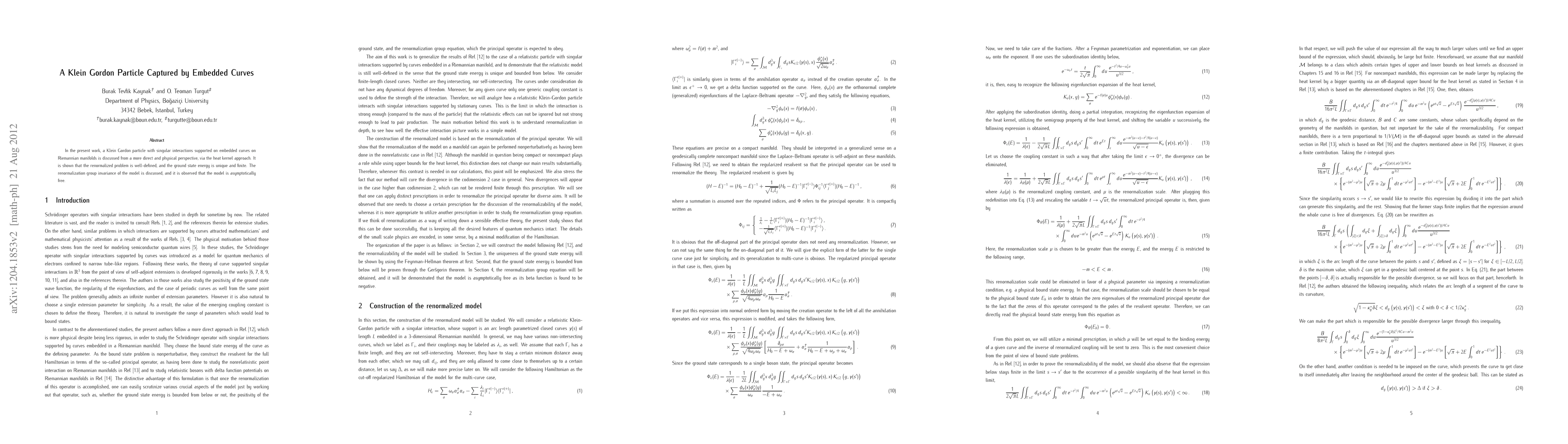 In the present work, a Klein Gordon particle with singular interactions supported on embedded curves on Riemannian manifolds is discussed from a more direct and physical perspective, via the heat kernel approach. It is shown that the renormalized problem is well-defined, and the ground state energy is unique and finite. The renormalization group invariance of the model is discussed, and it is observed that the model is asymptotically free.