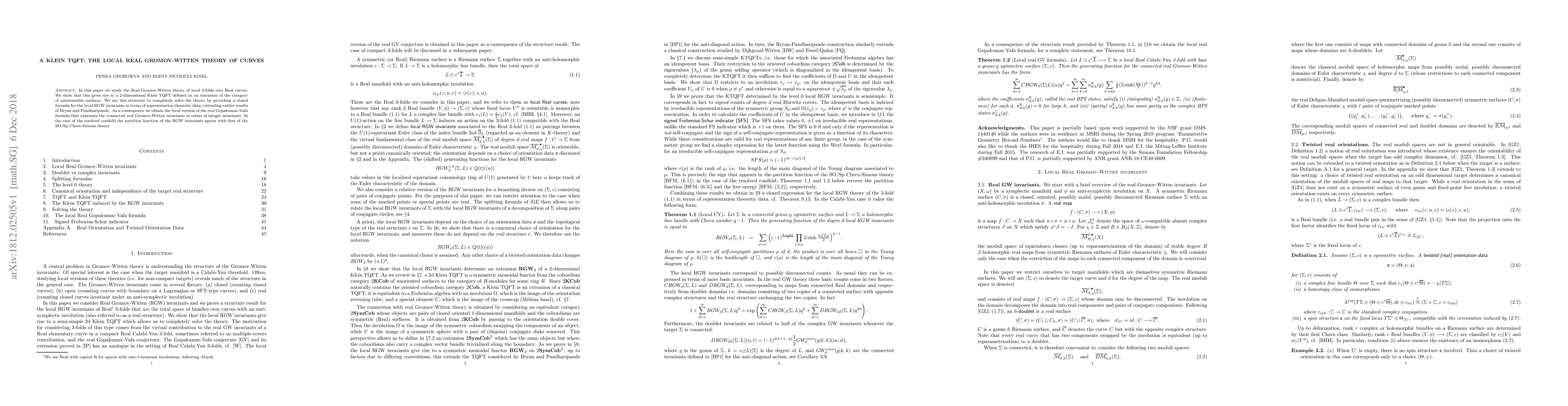 In this paper we study the Real Gromov-Witten theory of local 3-folds over Real curves. We show that this gives rise to a 2-dimensional Klein TQFT defined on an extension of the category of unorientable surfaces. We use this structure to completely solve the theory by providing a closed formula for the local RGW invariants in terms of representation theoretic data, extending earlier results of Bryan and Pandharipande. As a consequence we obtain the local version of the real Gopakumar-Vafa formula that expresses the connected real Gromov-Witten invariants in terms of integer invariants. In the case of the resolved conifold the partition function of the RGW invariants agrees with that of the SO/Sp Chern-Simons theory.