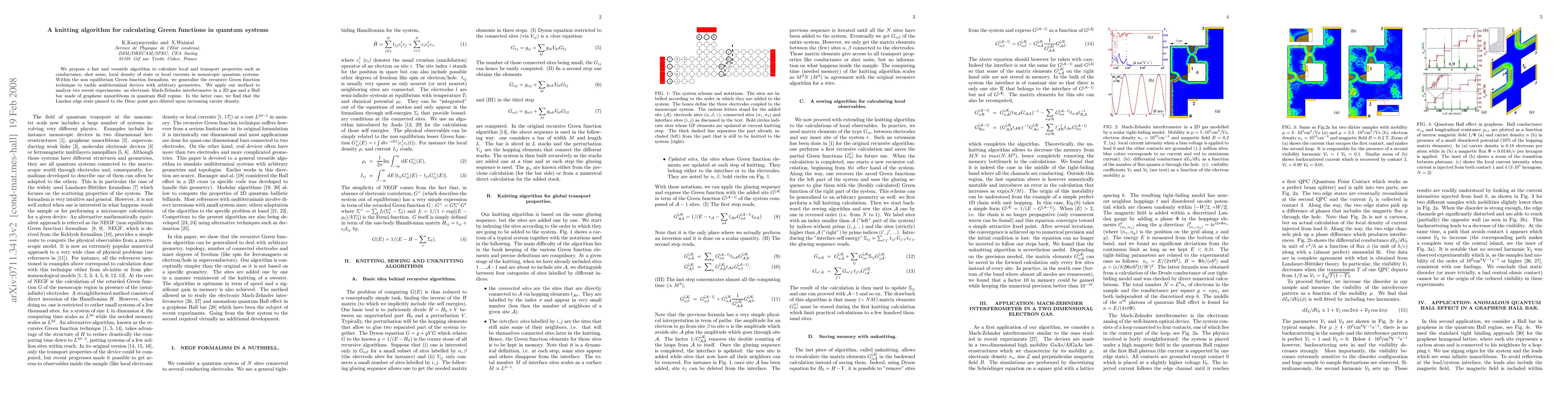 This paper introduces a novel knitting algorithm for efficiently calculating local and transport properties in quantum systems using the non-equilibrium Green function formalism. The method is applied to analyze experimental data from electronic interferometers and graphene nanoribbons, revealing the dilution of Landau edge states with increased carrier density.