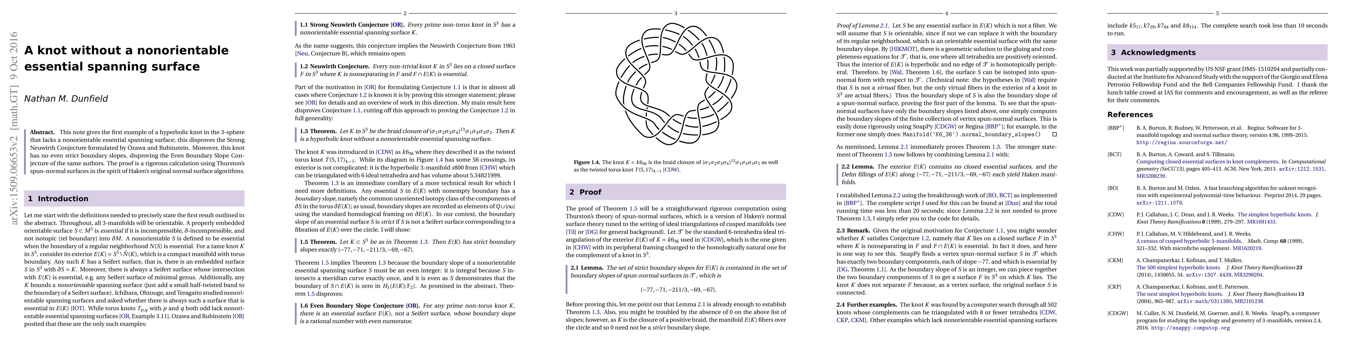 Researchers disprove two prominent conjectures in knot theory by finding a hyperbolic knot without a nonorientable essential spanning surface, which also lacks even strict boundary slopes.