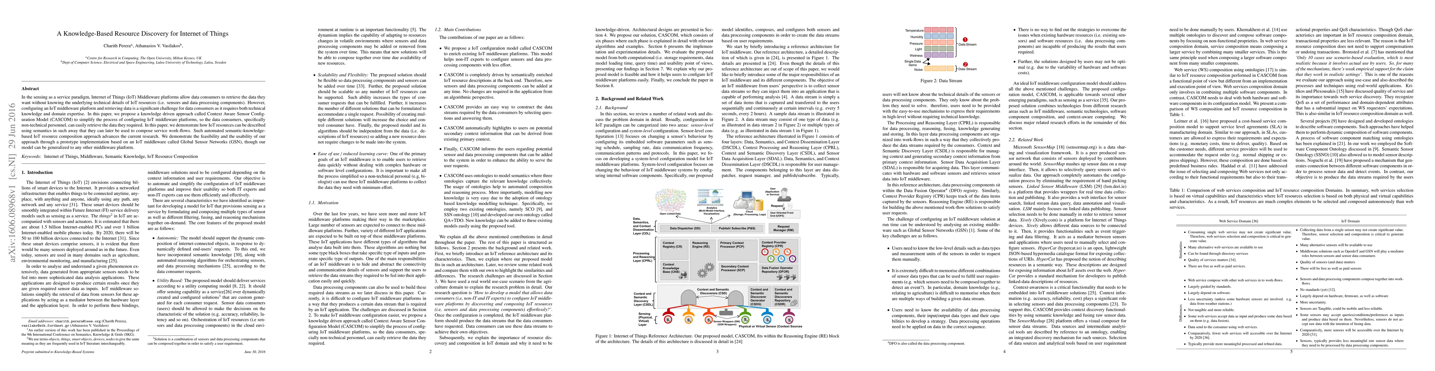 This paper proposes a knowledge-driven approach, the Context Aware Sensor Configuration Model (CASCOM), to simplify IoT middleware configuration for non-technical users. It demonstrates an automated semantic-knowledge based method for composing IoT resource workflows, validated through a prototype implementation on Global Sensor Networks (GSN).