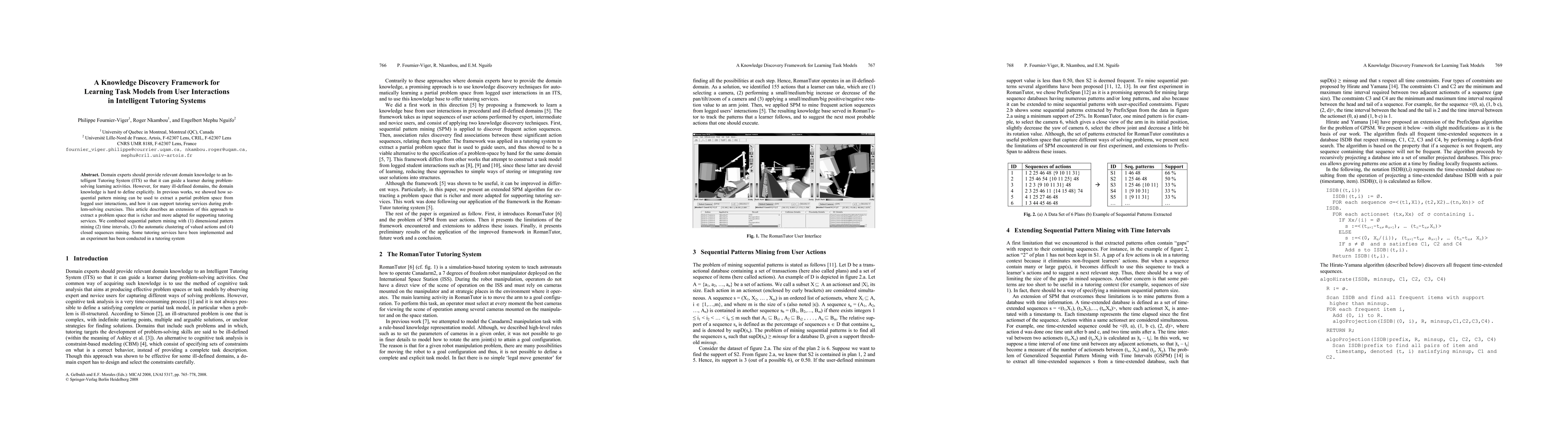Domain experts should provide relevant domain knowledge to an Intelligent Tutoring System (ITS) so that it can guide a learner during problemsolving learning activities. However, for many ill-defined domains, the domain knowledge is hard to define explicitly. In previous works, we showed how sequential pattern mining can be used to extract a partial problem space from logged user interactions, and how it can support tutoring services during problem-solving exercises. This article describes an extension of this approach to extract a problem space that is richer and more adapted for supporting tutoring services. We combined sequential pattern mining with (1) dimensional pattern mining (2) time intervals, (3) the automatic clustering of valued actions and (4) closed sequences mining. Some tutoring services have been implemented and an experiment has been conducted in a tutoring system.
