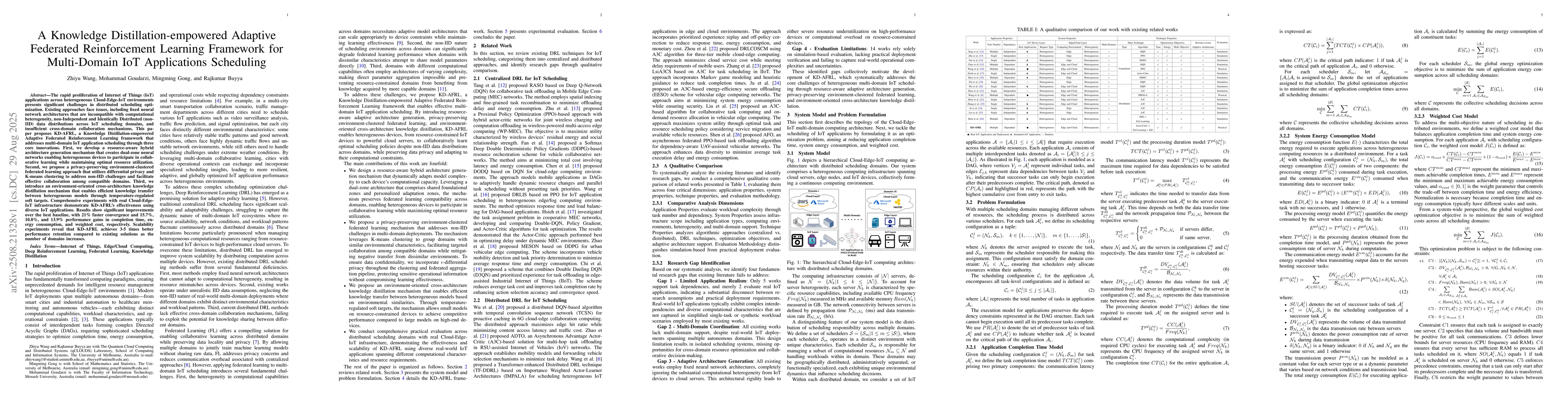 The rapid proliferation of Internet of Things (IoT) applications across heterogeneous Cloud-Edge-IoT environments presents significant challenges in distributed scheduling optimization. Existing approaches face issues, including fixed neural network architectures that are incompatible with computational heterogeneity, non-Independent and Identically Distributed (non-IID) data distributions across IoT scheduling domains, and insufficient cross-domain collaboration mechanisms. This paper proposes KD-AFRL, a Knowledge Distillation-empowered Adaptive Federated Reinforcement Learning framework that addresses multi-domain IoT application scheduling through three core innovations. First, we develop a resource-aware hybrid architecture generation mechanism that creates dual-zone neural networks enabling heterogeneous devices to participate in collaborative learning while maintaining optimal resource utilization. Second, we propose a privacy-preserving environment-clustered federated learning approach that utilizes differential privacy and K-means clustering to address non-IID challenges and facilitate effective collaboration among compatible domains. Third, we introduce an environment-oriented cross-architecture knowledge distillation mechanism that enables efficient knowledge transfer between heterogeneous models through temperature-regulated soft targets. Comprehensive experiments with real Cloud-Edge-IoT infrastructure demonstrate KD-AFRL's effectiveness using diverse IoT applications. Results show significant improvements over the best baseline, with 21% faster convergence and 15.7%, 10.8%, and 13.9% performance gains in completion time, energy consumption, and weighted cost, respectively. Scalability experiments reveal that KD-AFRL achieves 3-5 times better performance retention compared to existing solutions as the number of domains increases.