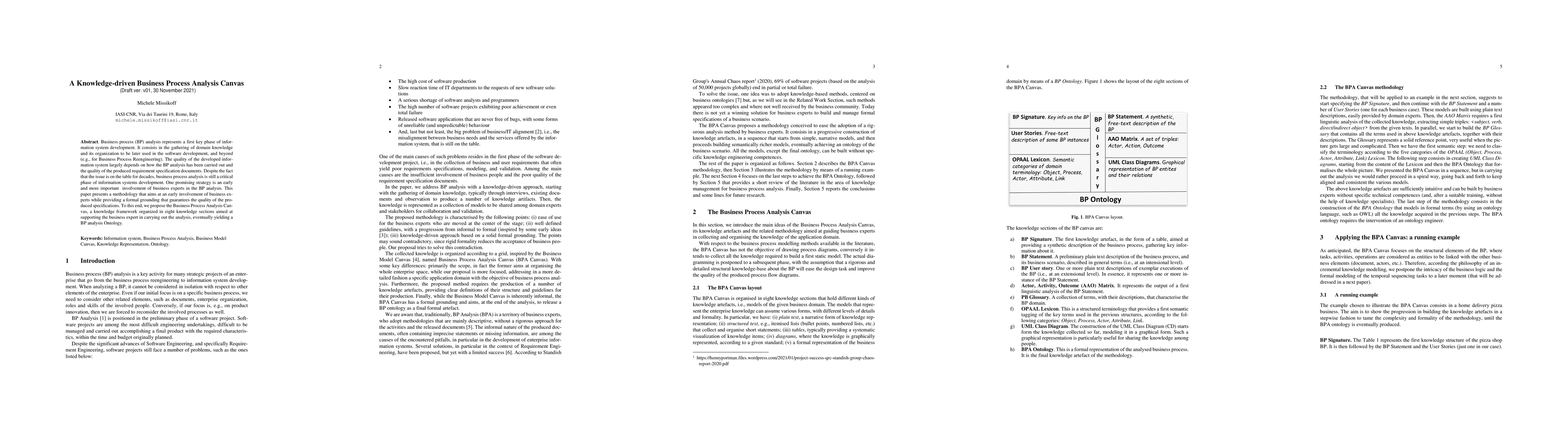 Business process (BP) analysis represents a first key phase of information system development. It consists in the gathering of domain knowledge and its organization to be later used in the software development, and beyond (e.g., for Business Process Reengineering). The quality of the developed information system largely depends on how the BP analysis has been carried out and the quality of the produced requirement specification documents. Despite the fact that the issue is on the table for decades, business process analysis is still a critical phase of information systems development. One promising strategy is an early and more important involvement of business experts in the BP analysis. This paper presents a methodology that aims at an early involvement of business experts while providing a formal grounding that guarantees the quality of the produced specifications. To this end, we propose the Business Process Analysis Canvas, a knowledge framework organized in eight knowledge sections aimed at supporting the business expert in carrying out the analysis, eventually yielding a BP analysis Ontology.