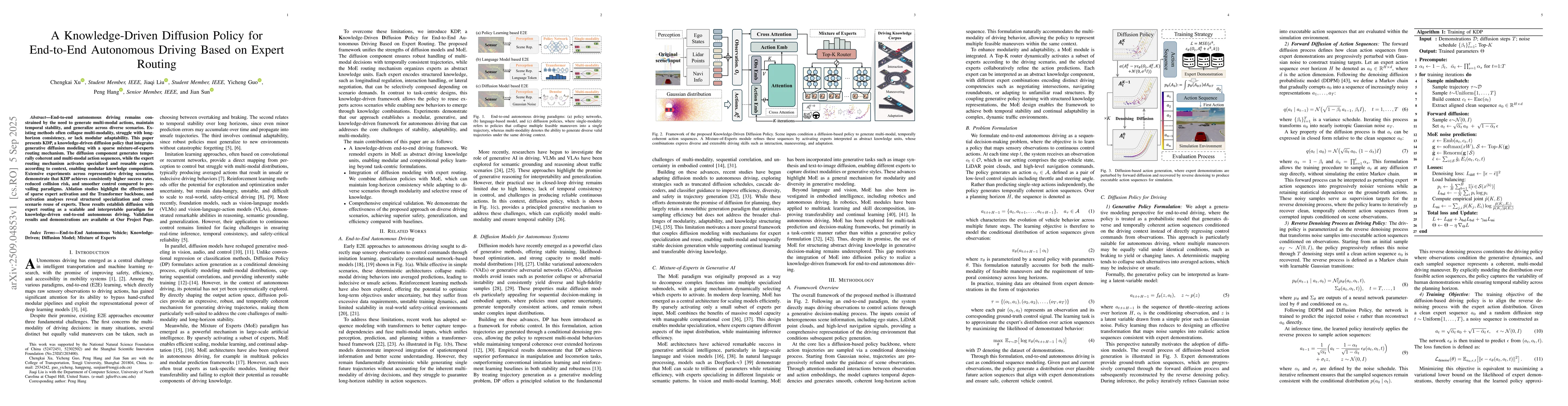 End-to-end autonomous driving remains constrained by the need to generate multi-modal actions, maintain temporal stability, and generalize across diverse scenarios. Existing methods often collapse multi-modality, struggle with long-horizon consistency, or lack modular adaptability. This paper presents KDP, a knowledge-driven diffusion policy that integrates generative diffusion modeling with a sparse mixture-of-experts routing mechanism. The diffusion component generates temporally coherent and multi-modal action sequences, while the expert routing mechanism activates specialized and reusable experts according to context, enabling modular knowledge composition. Extensive experiments across representative driving scenarios demonstrate that KDP achieves consistently higher success rates, reduced collision risk, and smoother control compared to prevailing paradigms. Ablation studies highlight the effectiveness of sparse expert activation and the Transformer backbone, and activation analyses reveal structured specialization and cross-scenario reuse of experts. These results establish diffusion with expert routing as a scalable and interpretable paradigm for knowledge-driven end-to-end autonomous driving.