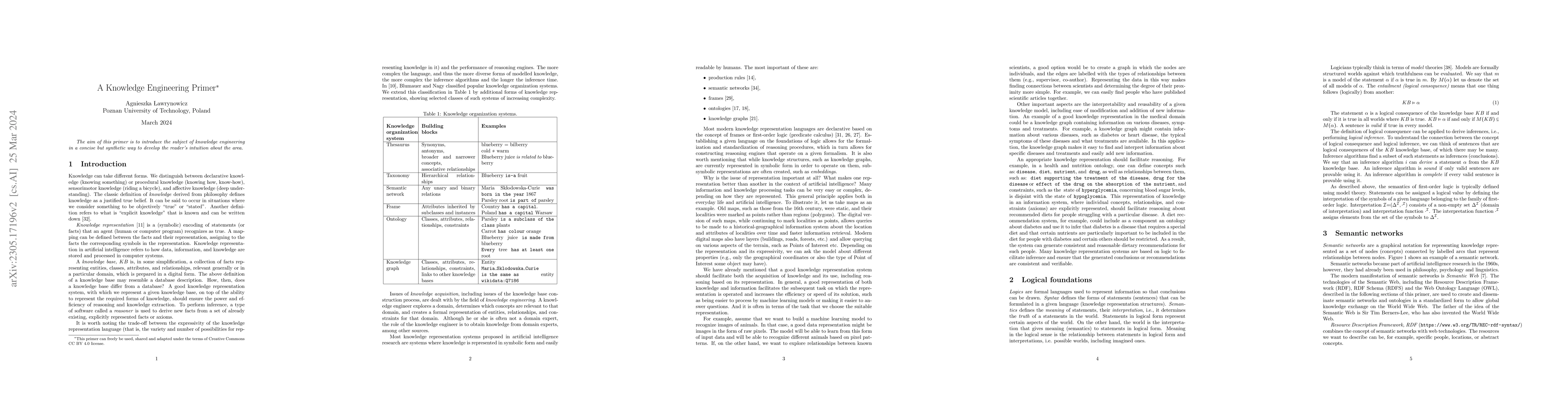 The aim of this primer is to introduce the subject of knowledge engineering in a concise but synthetic way to develop the reader's intuition about the area.