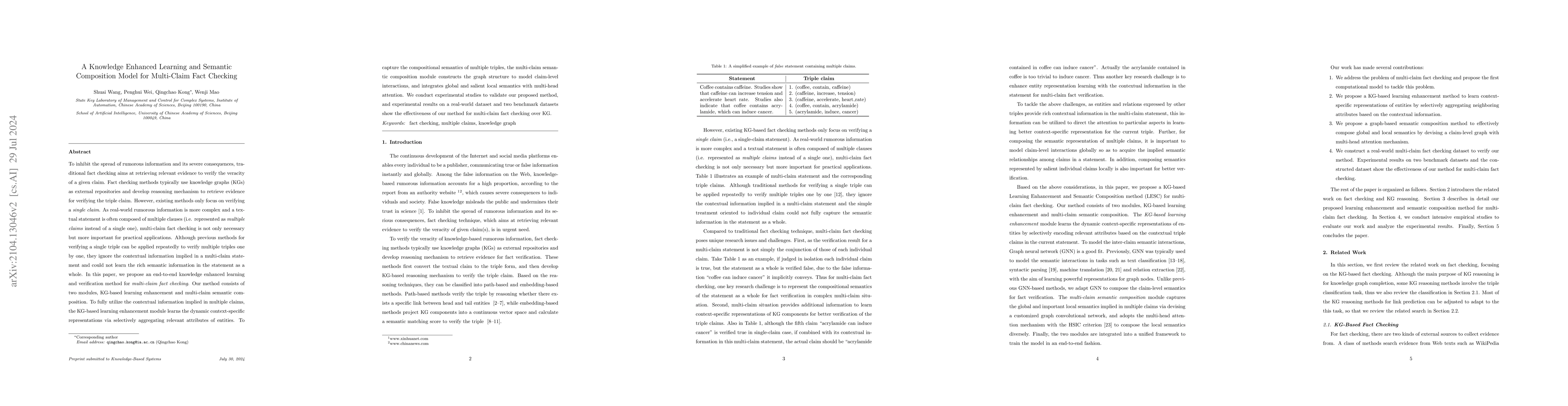 This paper proposes a novel method for multi-claim fact checking that utilizes knowledge graphs and semantic composition. It introduces two modules: KG-based learning enhancement and multi-claim semantic composition, which leverage contextual information and model interactions between multiple claims for effective verification. Experimental results demonstrate the method's superior performance compared to existing single-claim fact checking techniques.