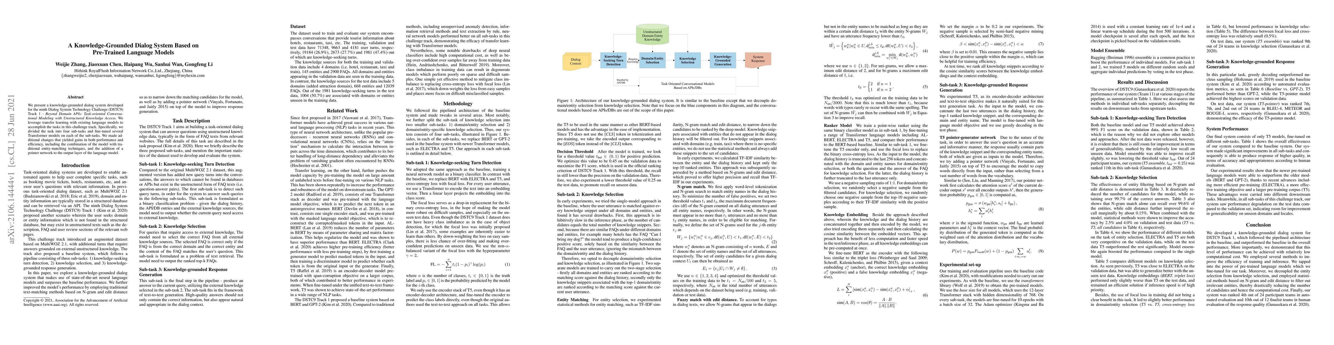 This paper introduces a knowledge-grounded dialog system for DSTC9 Track 1, utilizing pre-trained language models fine-tuned for four sub-tasks. Enhancements include combining the model with entity-matching techniques and adding a pointer network, improving both performance and efficiency.