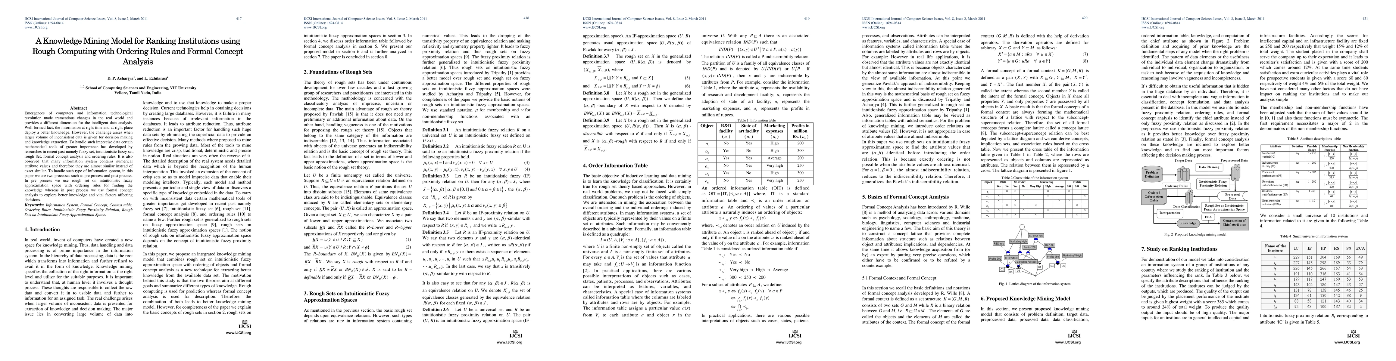 This paper proposes a knowledge mining model using rough set theory, intuitionistic fuzzy approximation space, ordering rules, and formal concept analysis to rank institutions. The model addresses the challenge of handling large volumes of inconsistent data by employing preprocessing and postprocessing techniques to extract and rank knowledge effectively.