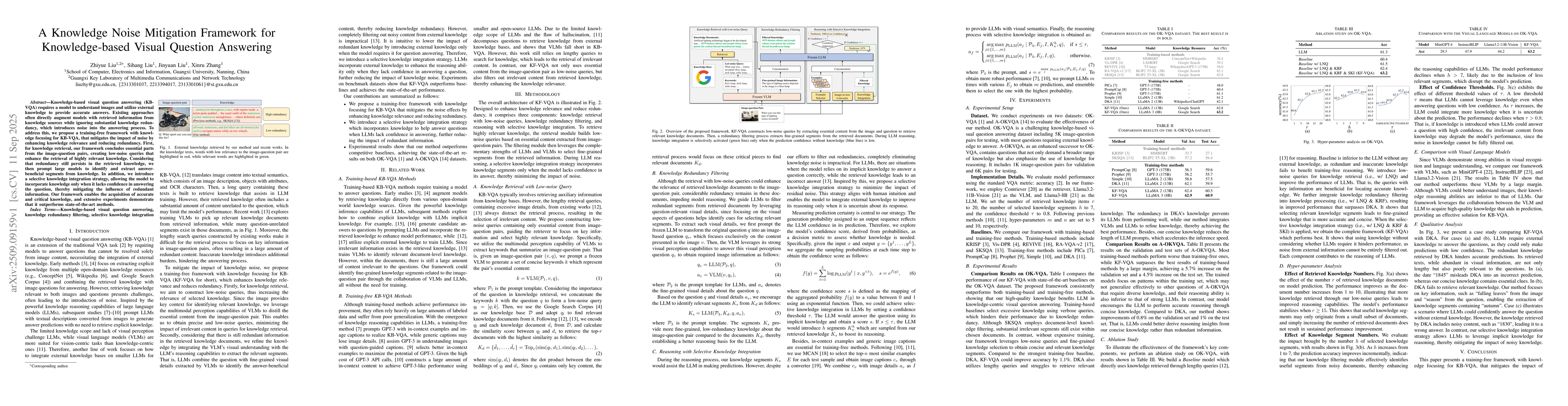 Knowledge-based visual question answering (KB-VQA) requires a model to understand images and utilize external knowledge to provide accurate answers. Existing approaches often directly augment models with retrieved information from knowledge sources while ignoring substantial knowledge redundancy, which introduces noise into the answering process. To address this, we propose a training-free framework with knowledge focusing for KB-VQA, that mitigates the impact of noise by enhancing knowledge relevance and reducing redundancy. First, for knowledge retrieval, our framework concludes essential parts from the image-question pairs, creating low-noise queries that enhance the retrieval of highly relevant knowledge. Considering that redundancy still persists in the retrieved knowledge, we then prompt large models to identify and extract answer-beneficial segments from knowledge. In addition, we introduce a selective knowledge integration strategy, allowing the model to incorporate knowledge only when it lacks confidence in answering the question, thereby mitigating the influence of redundant information. Our framework enables the acquisition of accurate and critical knowledge, and extensive experiments demonstrate that it outperforms state-of-the-art methods.