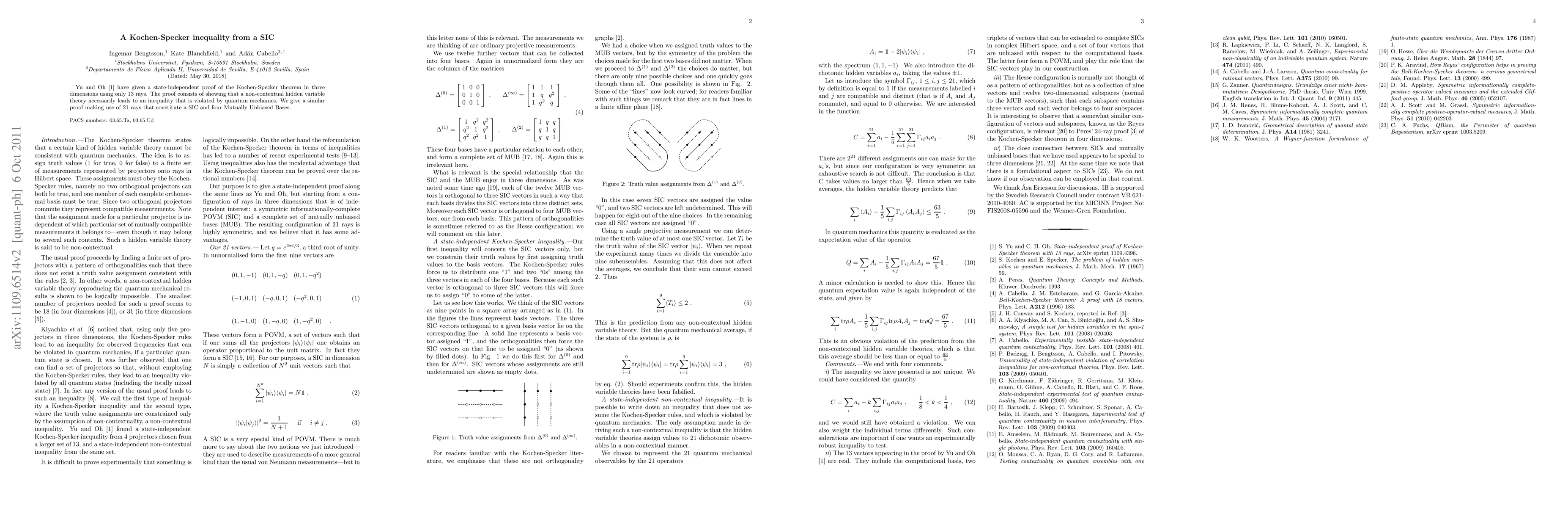 Summary: This paper provides a state-independent proof of the Kochen-Specker theorem using 21 rays from a SIC and four Mutually Unbiased Bases, showing that non-contextual hidden variable theories violate a specific inequality, which quantum mechanics does not satisfy.
