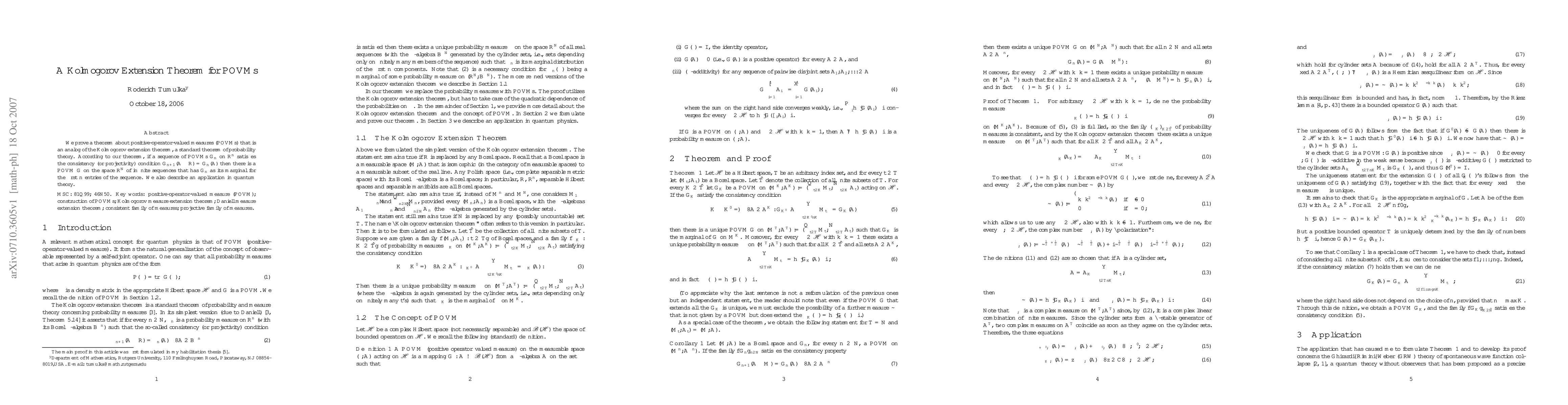 We prove a theorem about positive-operator-valued measures (POVMs) that is an analog of the Kolmogorov extension theorem, a standard theorem of probability theory. According to our theorem, if a sequence of POVMs G_n on $\mathbb{R}^n$ satisfies the consistency (or projectivity) condition $G_{n+1}(A\times \mathbb{R}) = G_n(A)$ then there is a POVM G on the space $\mathbb{R}^\mathbb{N}$ of infinite sequences that has G_n as its marginal for the first n entries of the sequence. We also describe an application in quantum theory.