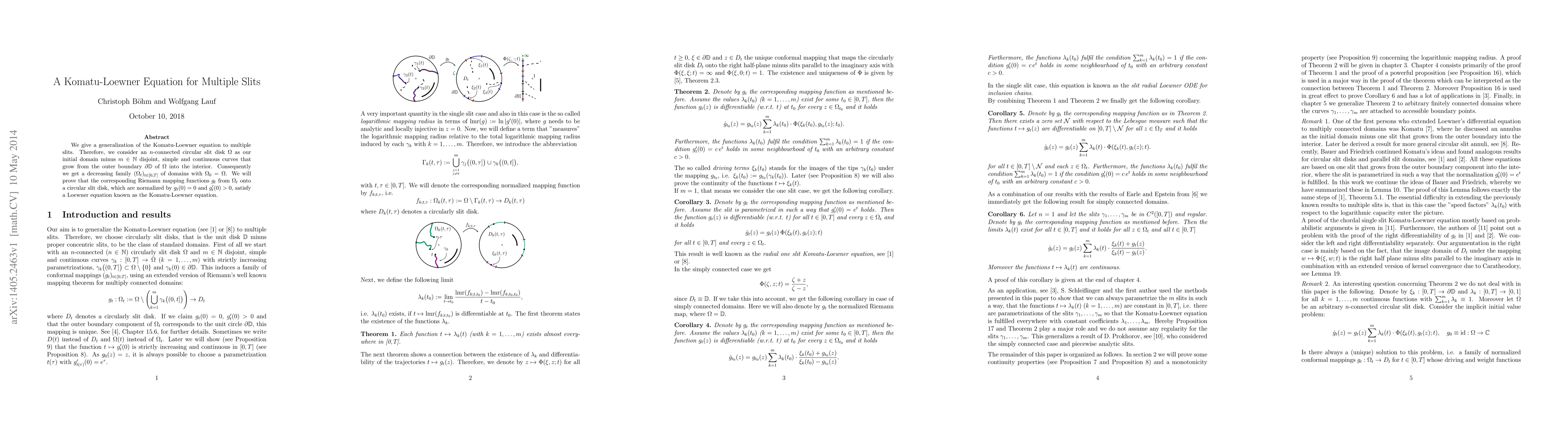 This paper generalizes the Komatu-Loewner equation to multiple slits by considering an $n$-connected circular slit disk with $m$ growing slits. It proves that the Riemann mapping functions for the evolving domains satisfy a modified Loewner equation.