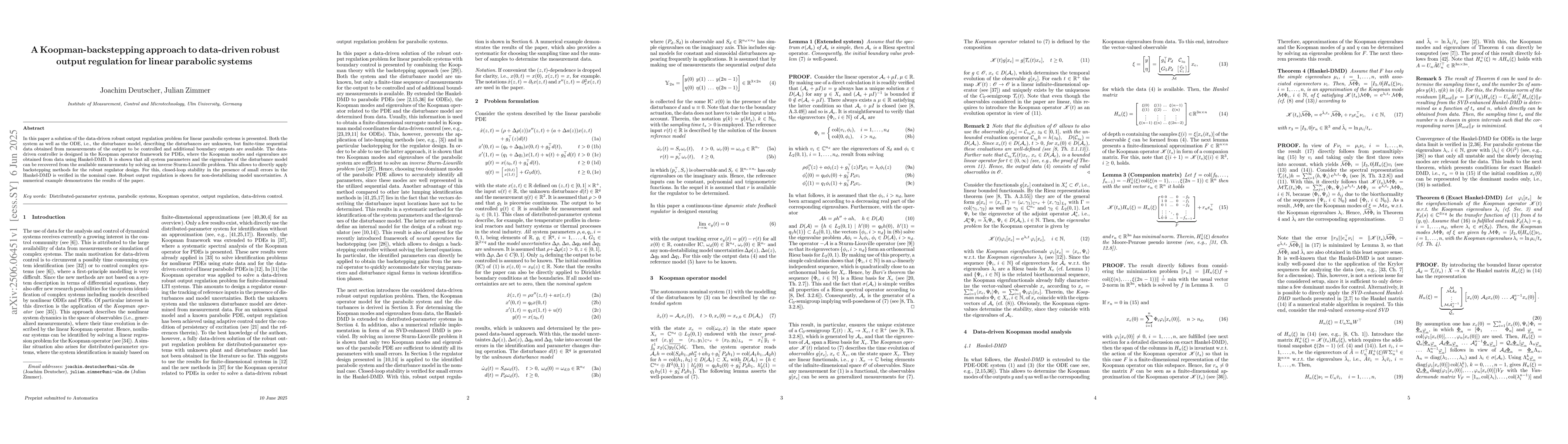 In this paper a solution of the data-driven robust output regulation problem for linear parabolic systems is presented. Both the system as well as the ODE, i.e., the disturbance model, describing the disturbances are unknown, but finite-time sequential data obtained from measurements of the output to be controlled and additional boundary outputs are available. The data-driven controller is designed in the Koopman operator framework for PDEs, where the Koopman modes and eigenvalues are obtained from data using Hankel-DMD. It is shown that all system parameters and the eigenvalues of the disturbance model can be recovered from the available measurements by solving an inverse Sturm-Liouville problem. This allows to directly apply backstepping methods for the robust regulator design. For this, closed-loop stability in the presence of small errors in the Hankel-DMD is verified in the nominal case. Robust output regulation is shown for non-destabilizing model uncertainties. A numerical example demonstrates the results of the paper.